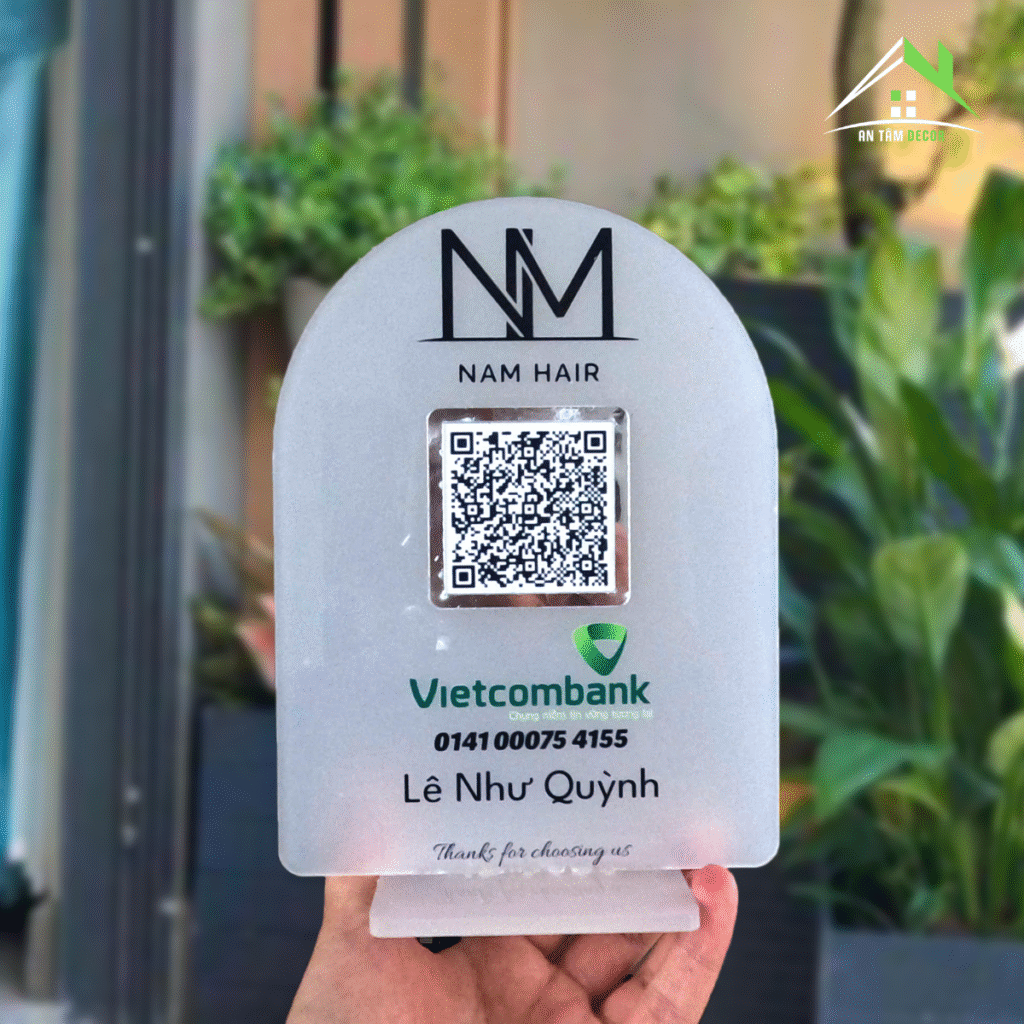 Cuối cùng, gắn bảng lên quầy thu ngân, cửa kính hoặc bàn làm việc. Bạn có thể dùng băng dính 2 mặt hoặc đặt trong khung gỗ/mica cho gọn đẹp và chuyên nghiệp. Nếu cần bảng kích thước chuẩn, đẹp như in UV, hãy liên hệ An Tâm Decor – tụi mình có sẵn các mẫu bảng QR sang trọng, bền và thiết kế theo yêu cầu.