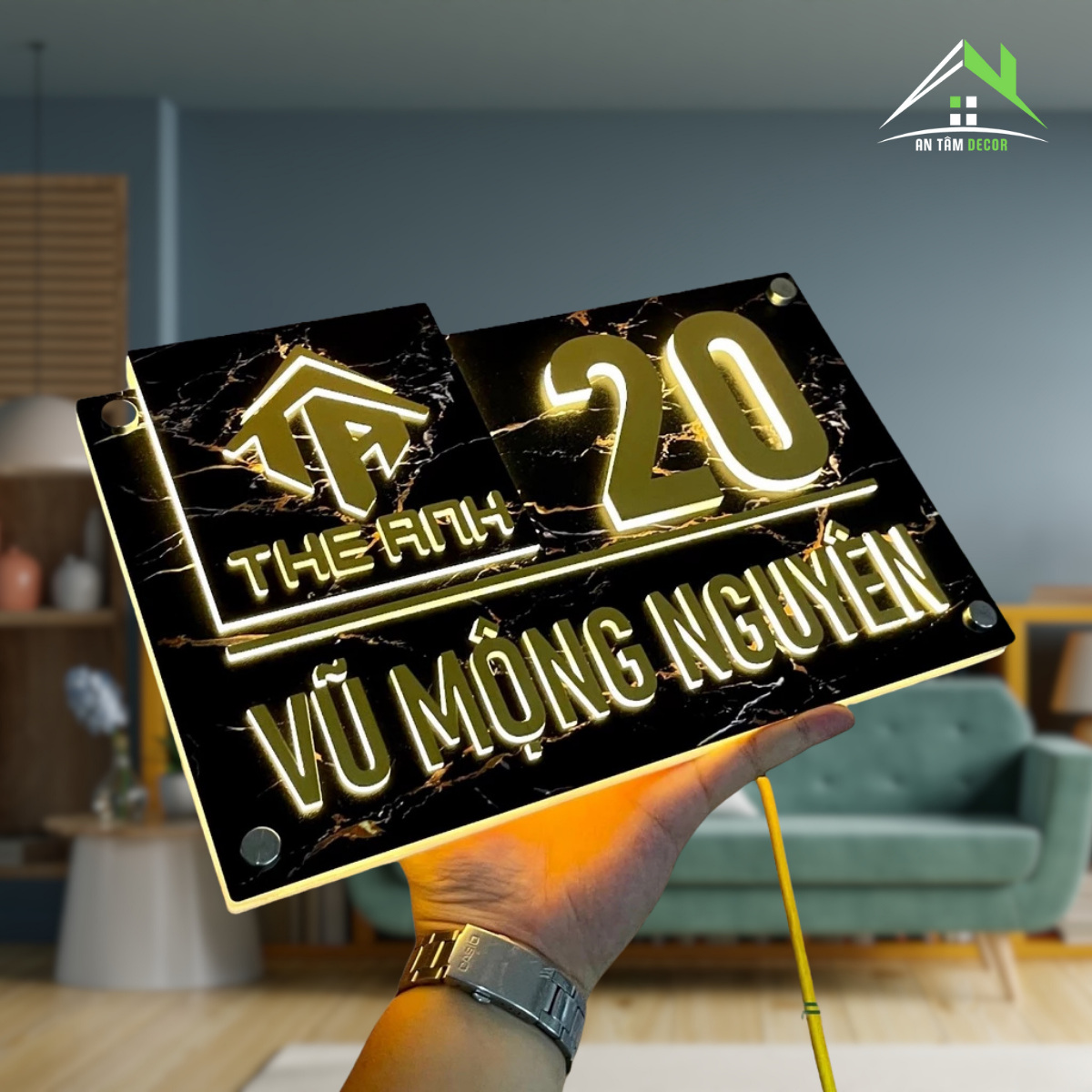 Bảng Số Nhà LED Mica Vân Đá – Inox 304 Vàng Gương Nổi Bật Ngoài Trời