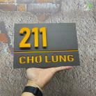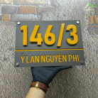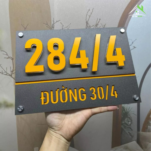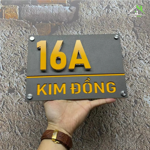 Kết hợp nền Alcorest màu vàng Hội An nổi bật với mặt mica ghi sần sang trọng. Số nhà được làm nổi dày 1cm, đế mica trong suốt 1cm – tạo hiệu ứng nổi khối bắt mắt và hiện đại.