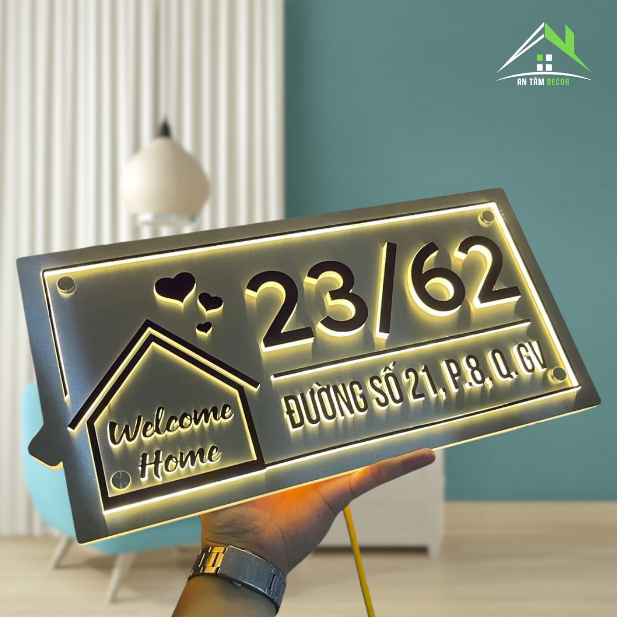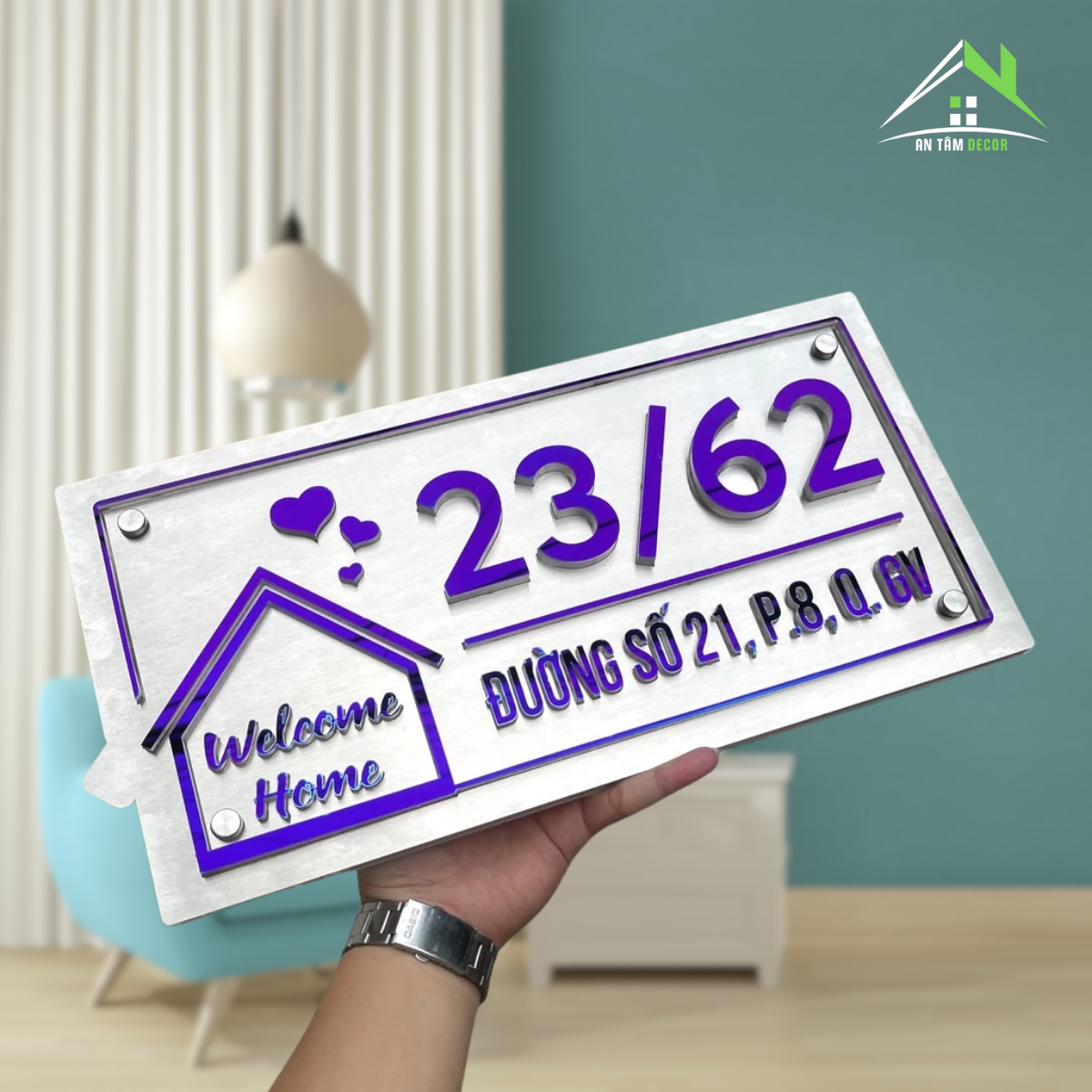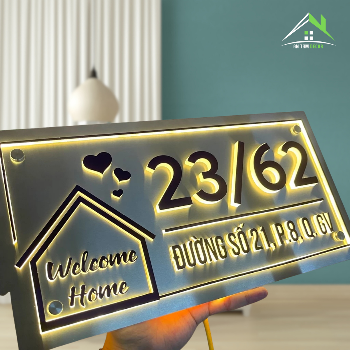Phong cách hiện đại, điểm nhấn là biểu tượng ngôi nhà “Welcome Home” cùng chi tiết trái tim tinh tế – mang lại cảm giác ấm áp và thân thiện cho người nhìn.