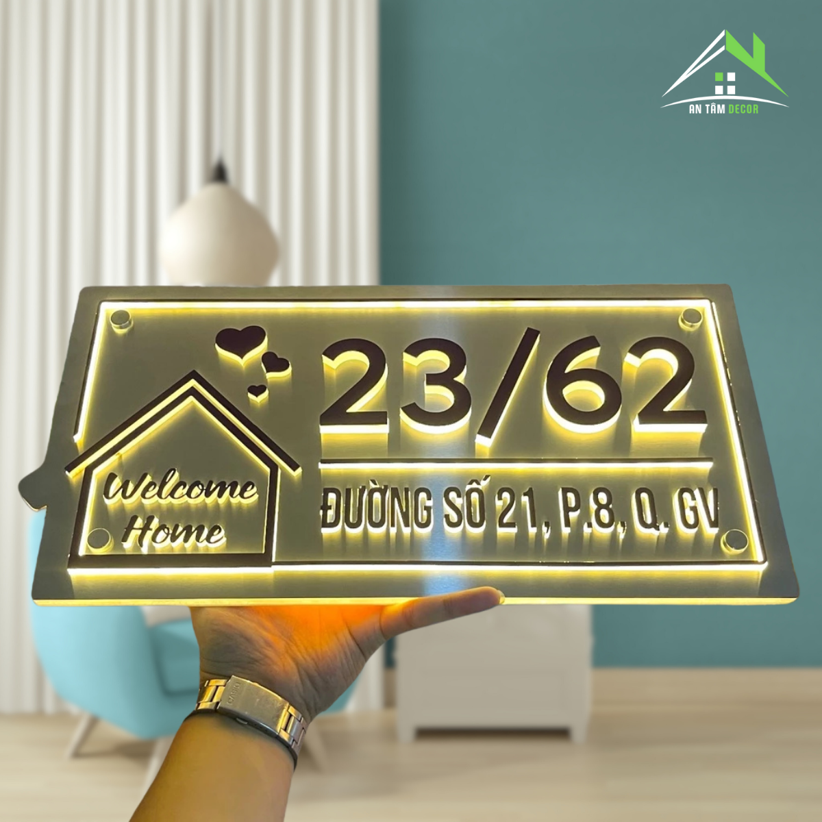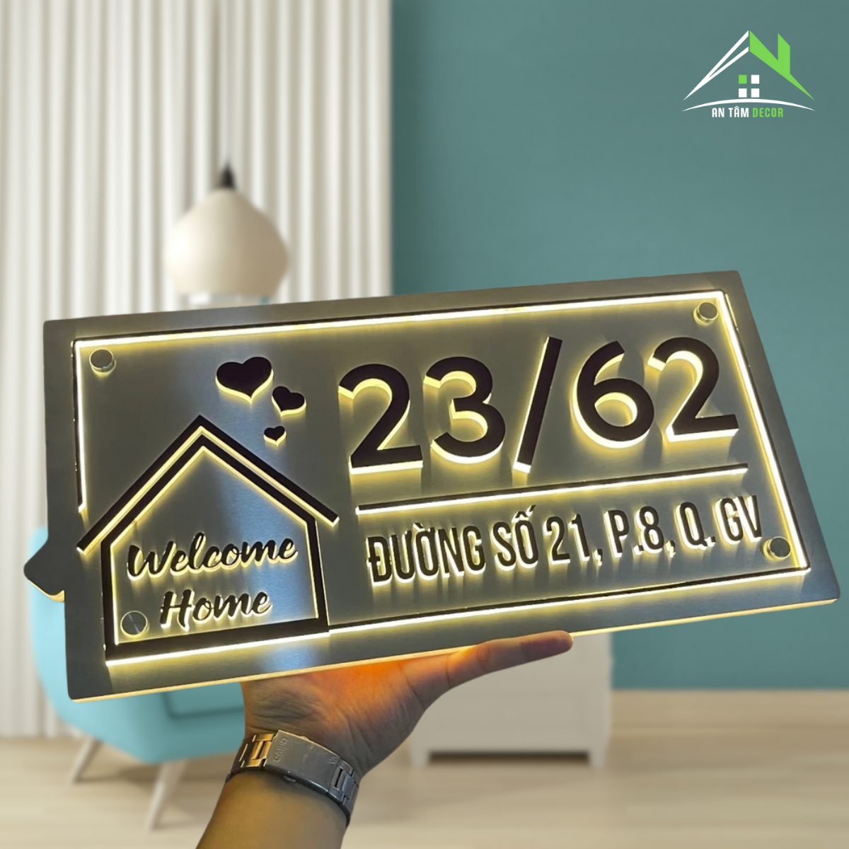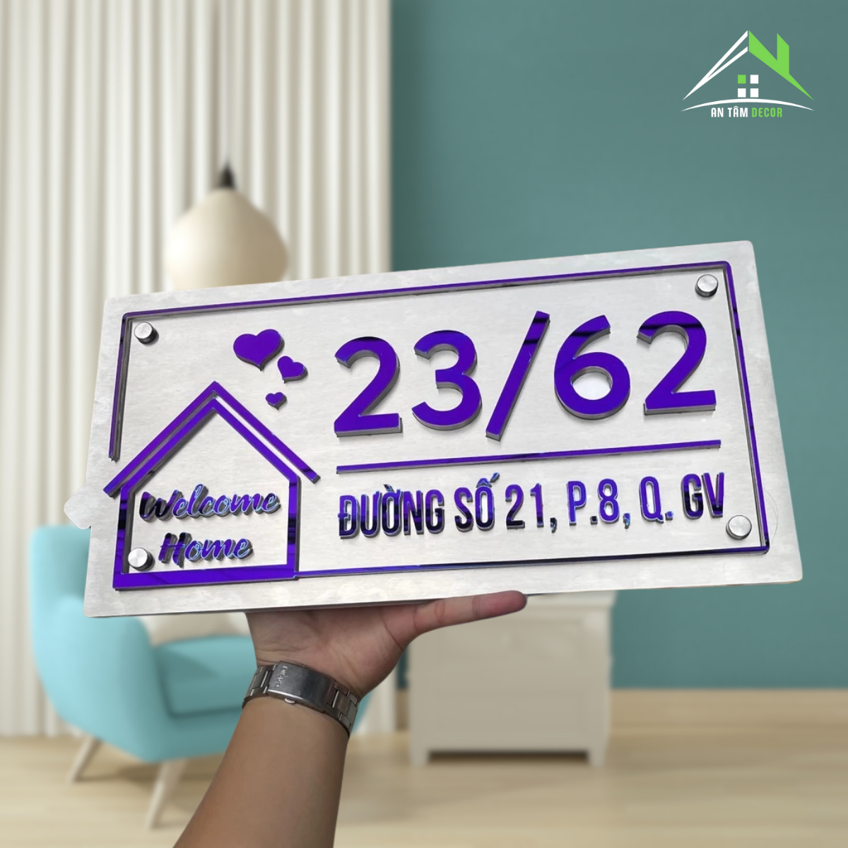Phong cách hiện đại, điểm nhấn là biểu tượng ngôi nhà “Welcome Home” cùng chi tiết trái tim tinh tế – mang lại cảm giác ấm áp và thân thiện cho người nhìn.