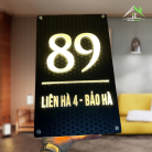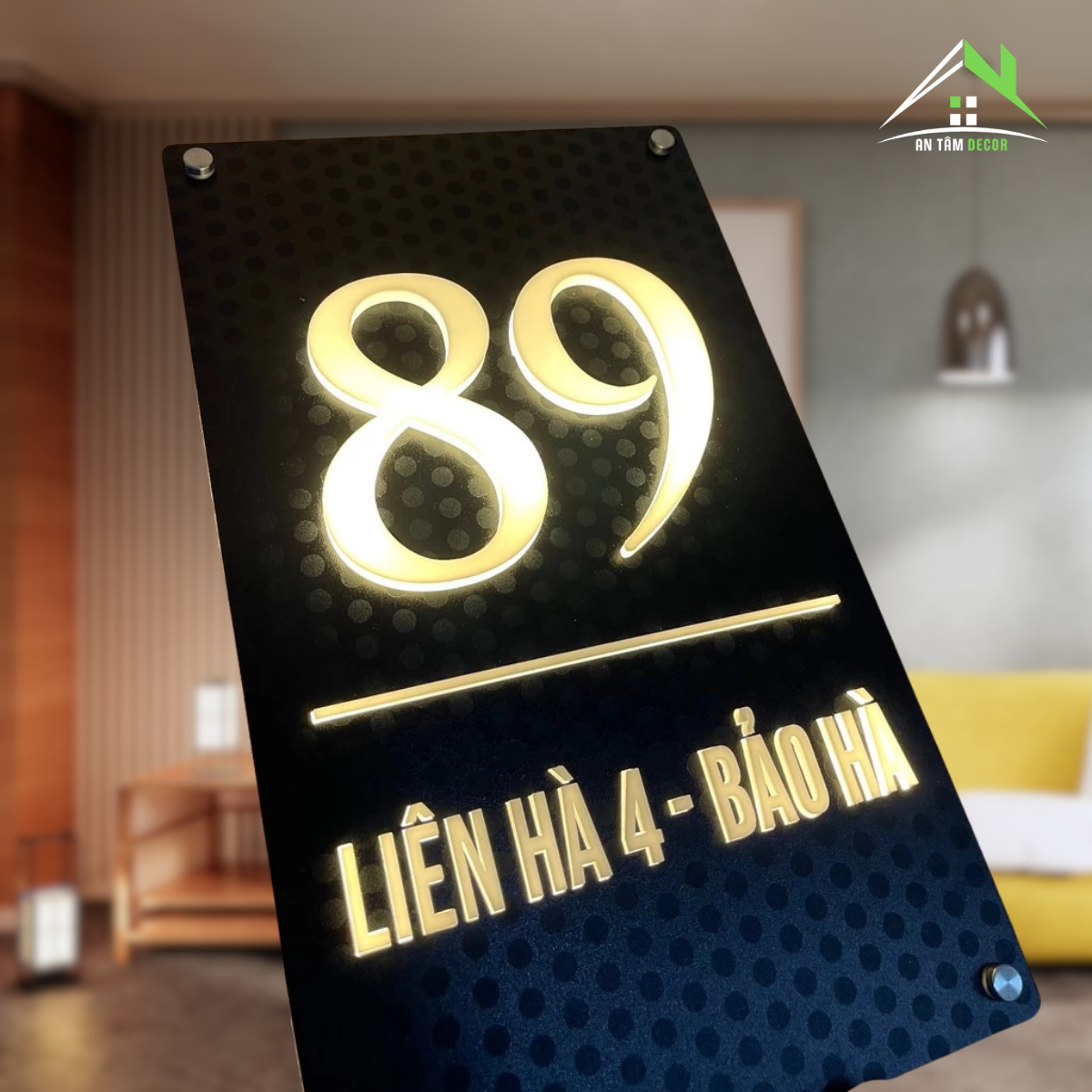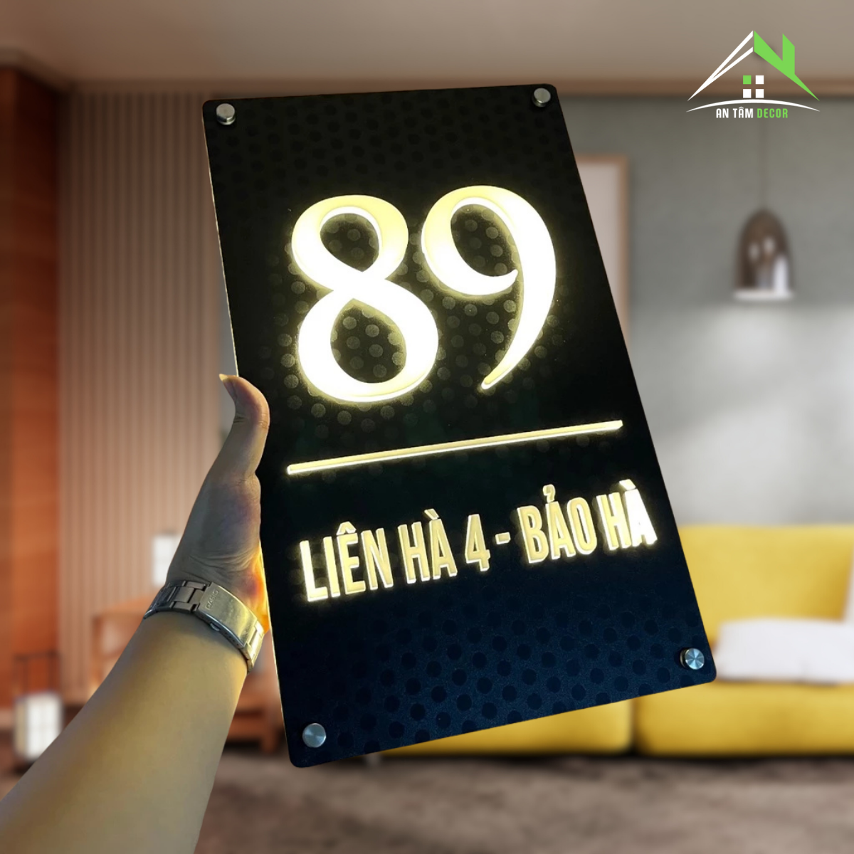 Bảng, Biển Số Nhà. Có Đèn LED, Mica Cháo + Mica Đen In Họa Tiết, Số Nổi 1cm, Ngoài Trời