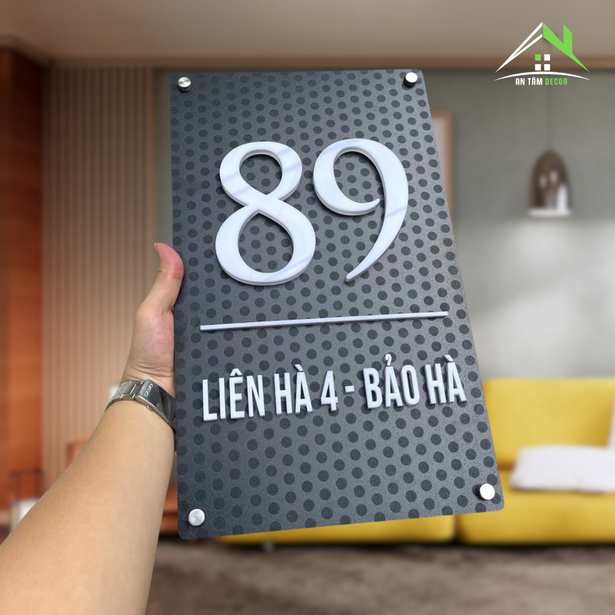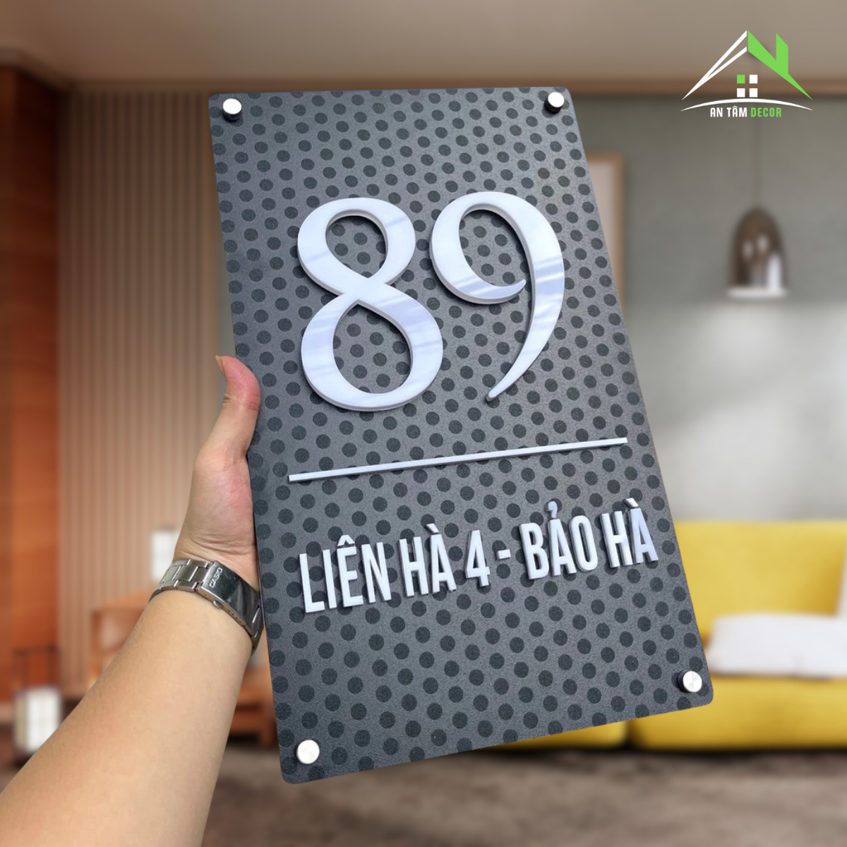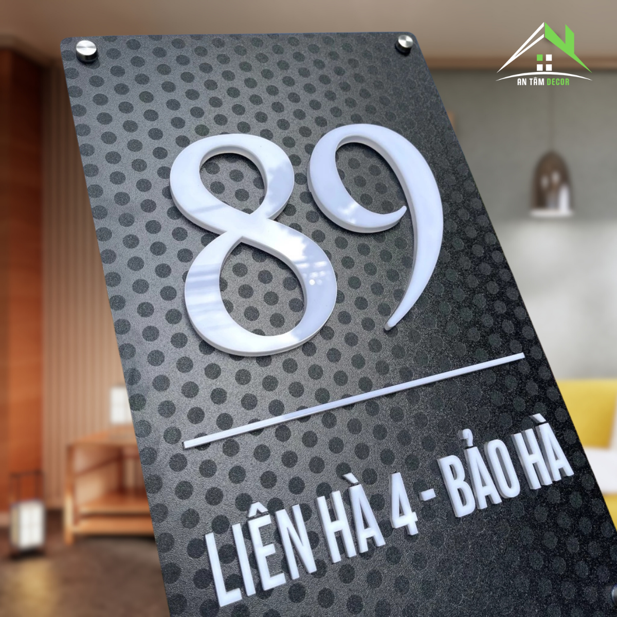 Bảng, Biển Số Nhà – Alcorest + Mica Đen Sần – Chữ Dán Nổi Đế Mica Trong 1cm – Lắp Ngoài Trời
