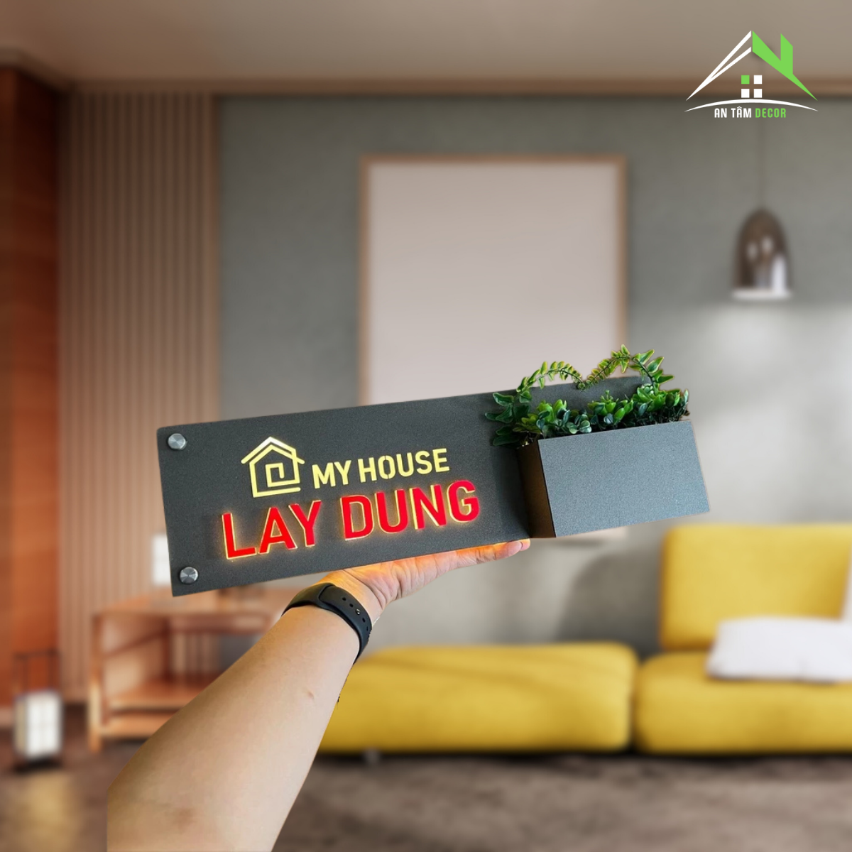 Thiết kế độc quyền từ An Tâm Decor, chất liệu mica bền đẹp, dễ lắp đặt, tiết kiệm điện, phù hợp mọi điều kiện thời tiết ngoài trời. Tích hợp trang trí cây tăng thẩm mỹ, khác biệt hoàn toàn với biển số nhà thông thường.