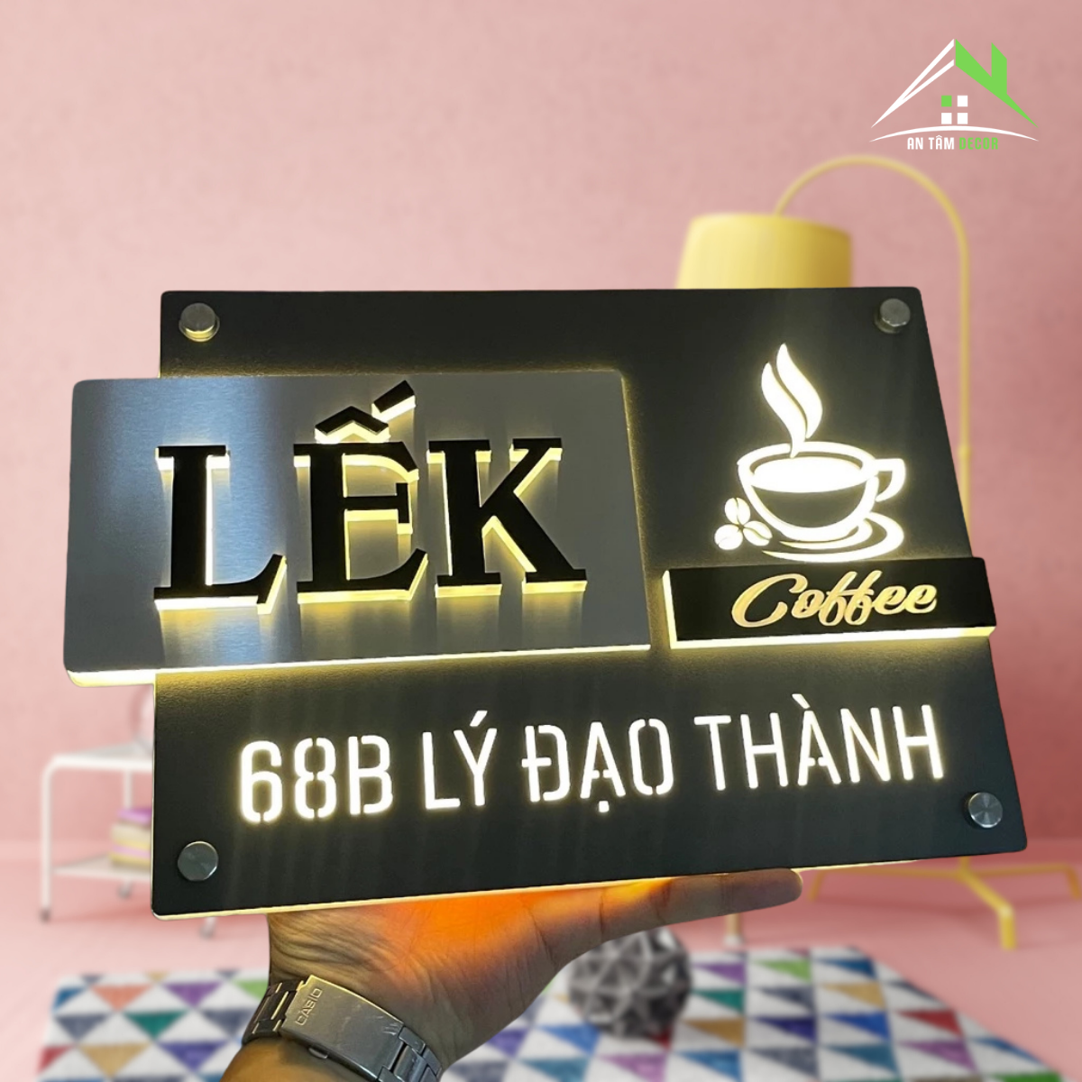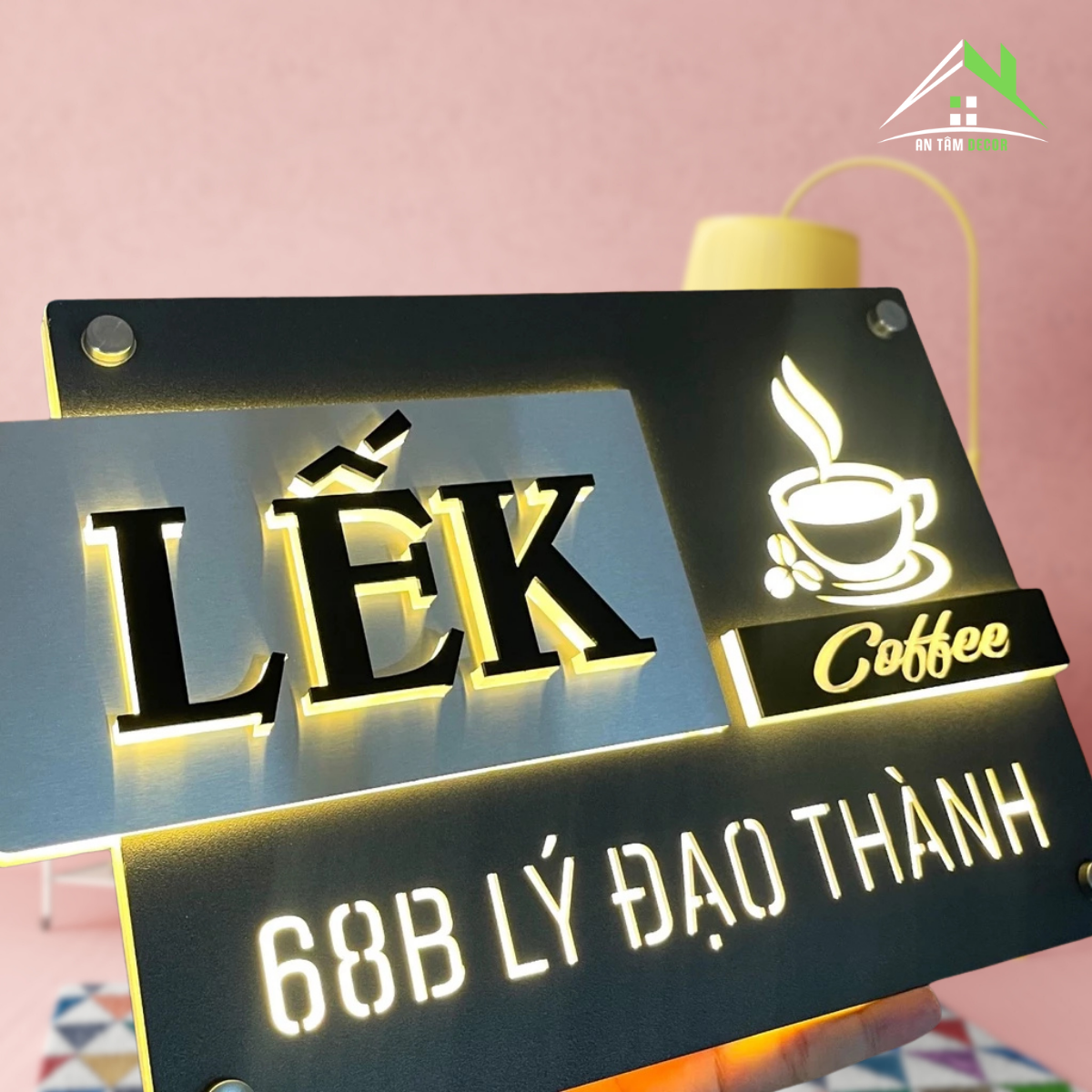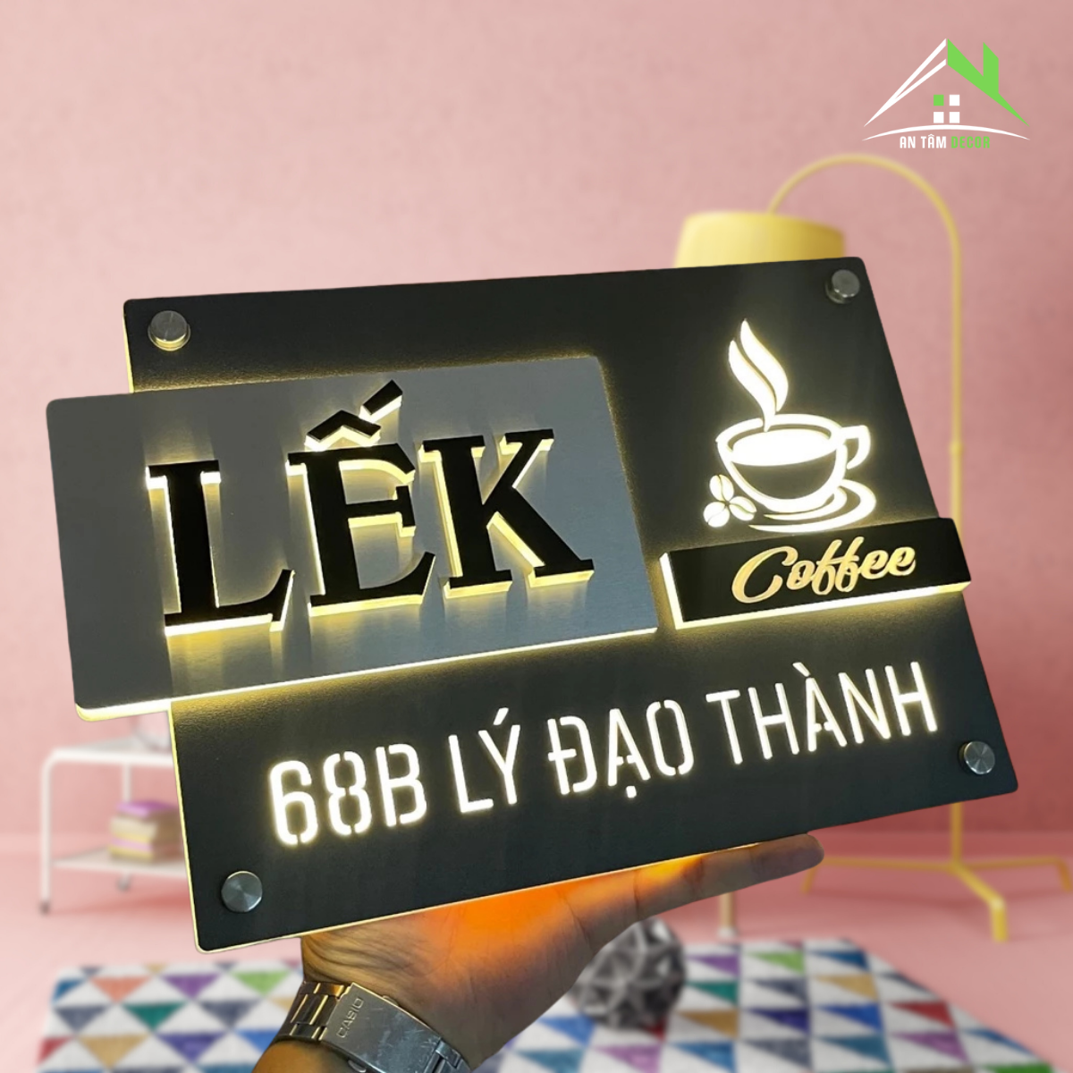 Biển thể hiện rõ thông tin tên quán – địa chỉ, dễ nhận biết vào ban ngày và nổi bật khi đèn LED chiếu sáng ban đêm. Thích hợp treo trước quán cà phê, nhà ở hoặc shop.