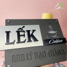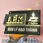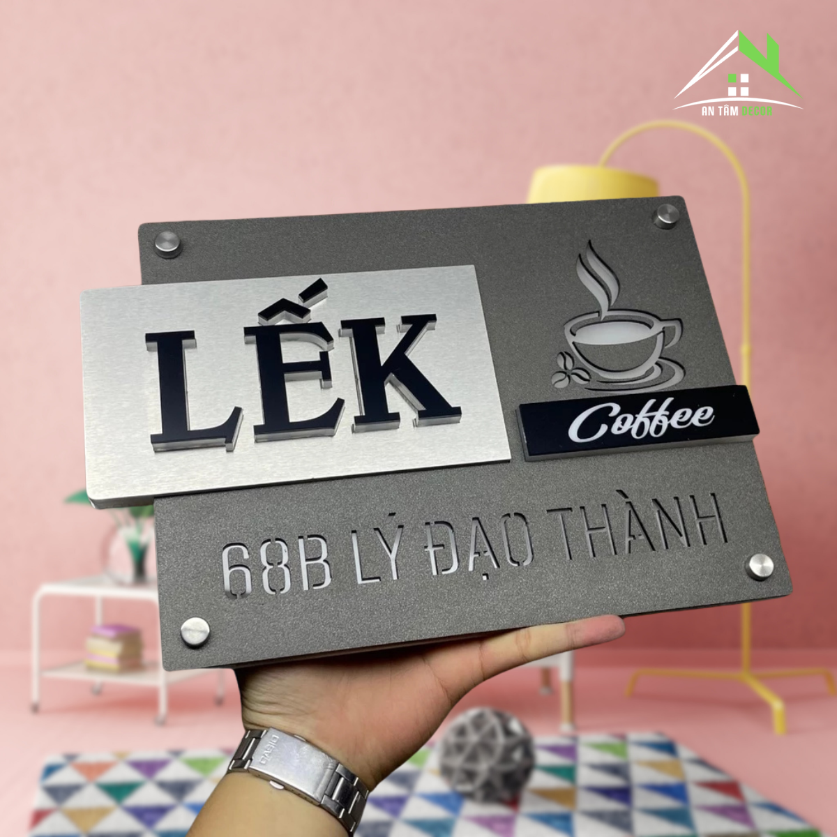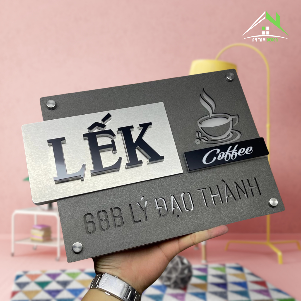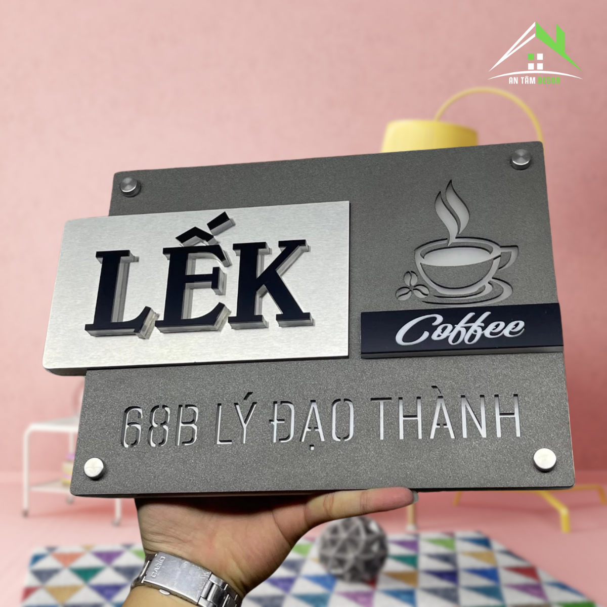 Biển thể hiện rõ thông tin tên quán – địa chỉ, dễ nhận biết vào ban ngày và nổi bật khi đèn LED chiếu sáng ban đêm. Thích hợp treo trước quán cà phê, nhà ở hoặc shop.