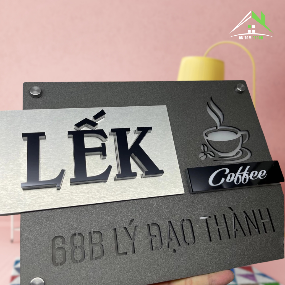 Thiết kế hiện đại, phối màu mạnh mẽ – tạo ấn tượng rõ ràng cho mặt tiền quán cà phê hoặc nhà ở. Phối chữ mica nổi đen trên nền ghi sần giúp biển sáng đẹp kể cả khi không bật đèn.