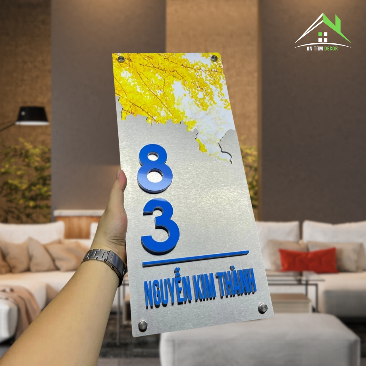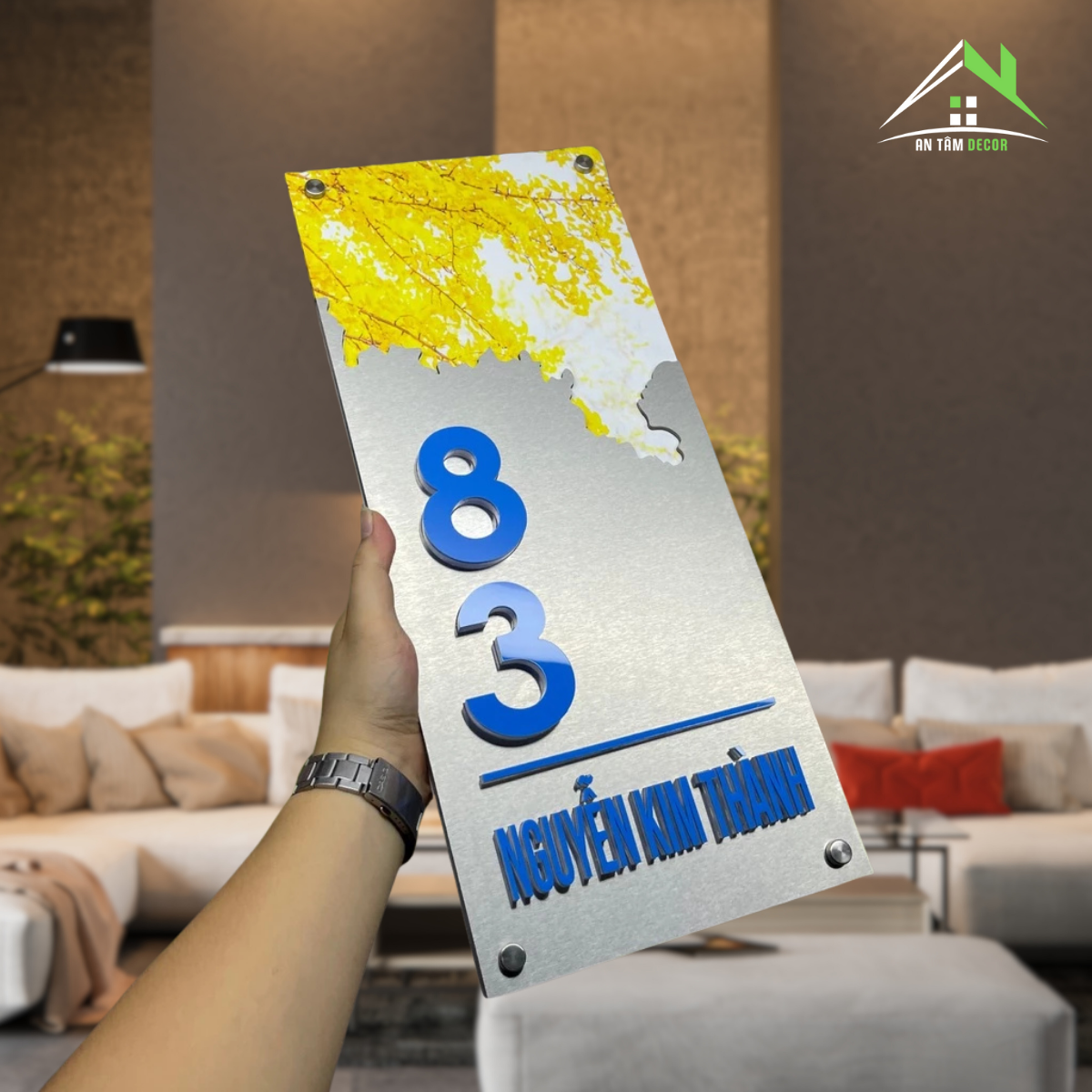 BẢNG, BIỂN SỐ NHÀ, Nền Alcorest +Mica cán ghi sần, inox 304 xước bạc, số nhà nổi, ngoài trời BSN-AT1
