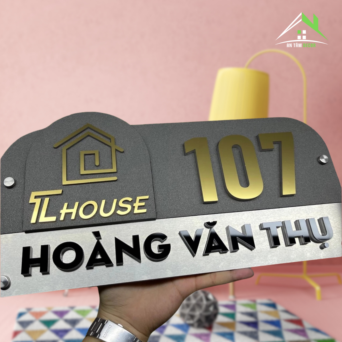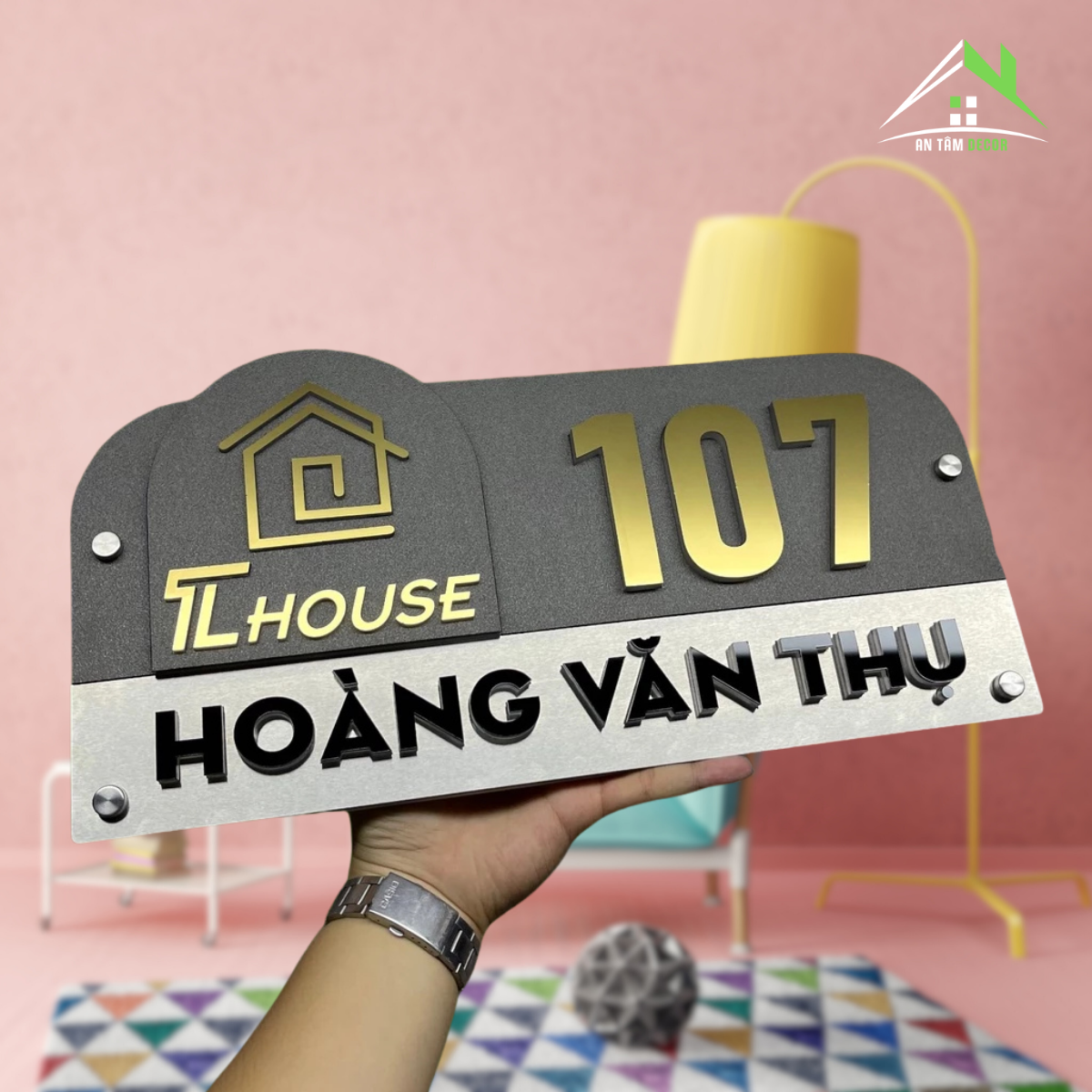Phong cách hiện đại, tinh tế. Logo TL HOUSE và số nhà được thiết kế riêng tạo điểm nhấn thương hiệu. Mặt dưới nền inox làm nổi bật phần tên đường sắc nét.