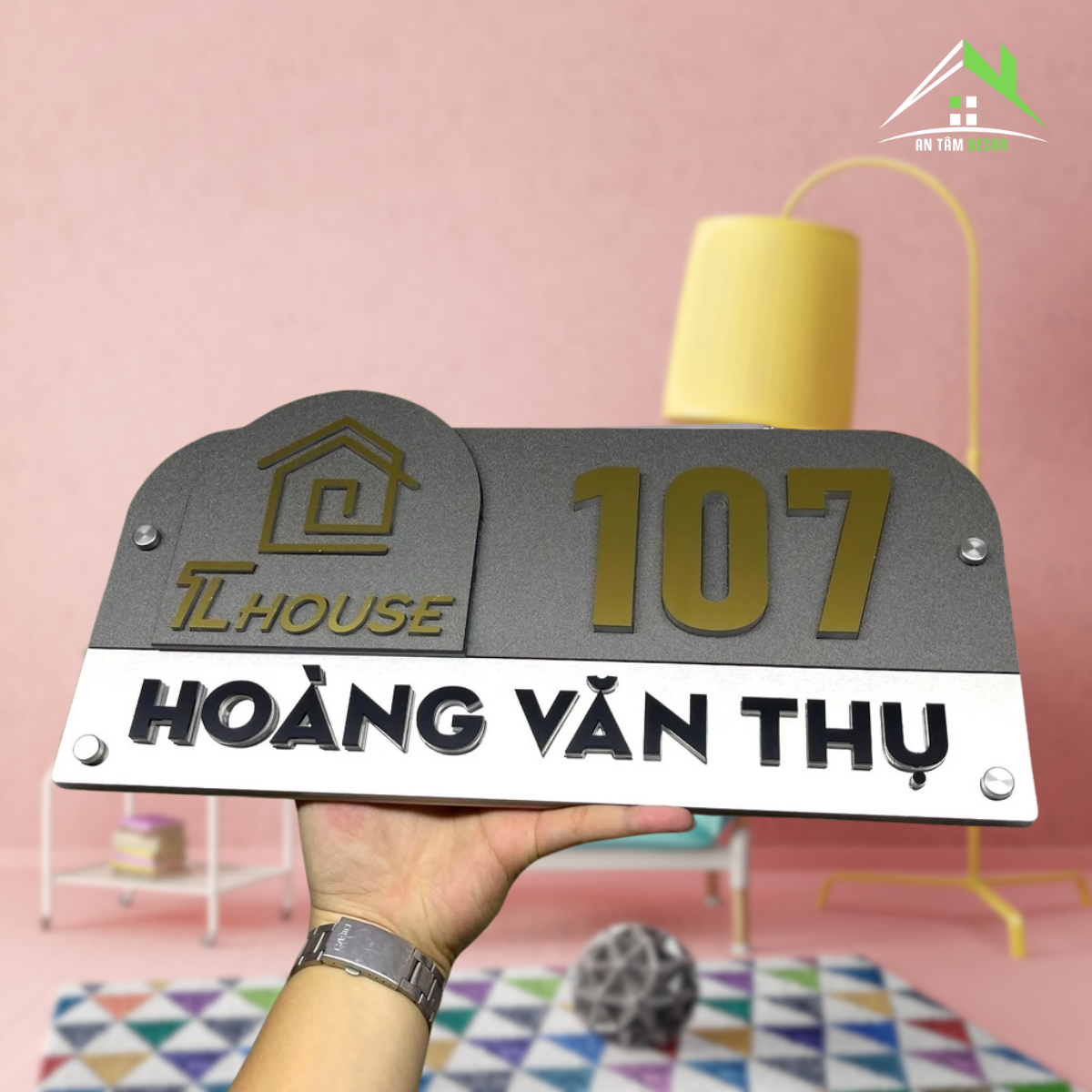 Tấm nền Alcorest phủ mica đen kết hợp inox vàng gương. Phần số và chữ nổi được làm từ mica đế trong 8mm, mặt inox vàng nổi bật, tạo độ bóng và chiều sâu sang trọng.
