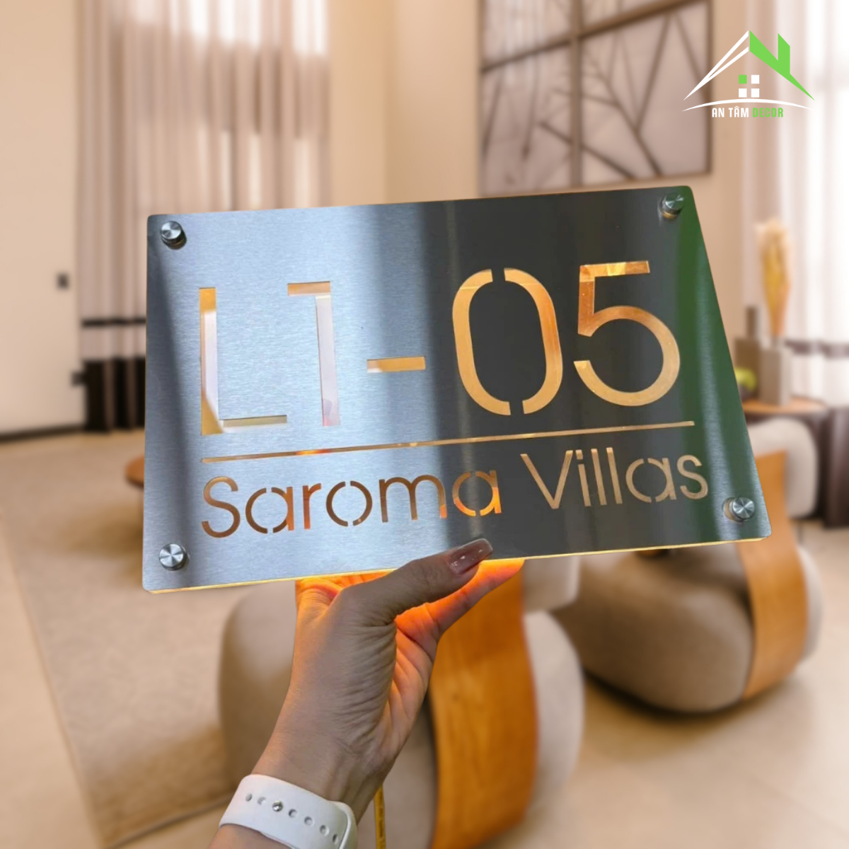 Biển số nhà được gia công từ inox trắng cắt CNC sắc nét, kết hợp nền mica trong suốt dày 8mm, mang đến vẻ ngoài hiện đại và đẳng cấp. Có thể thay đổi thành inox vàng theo yêu cầu.