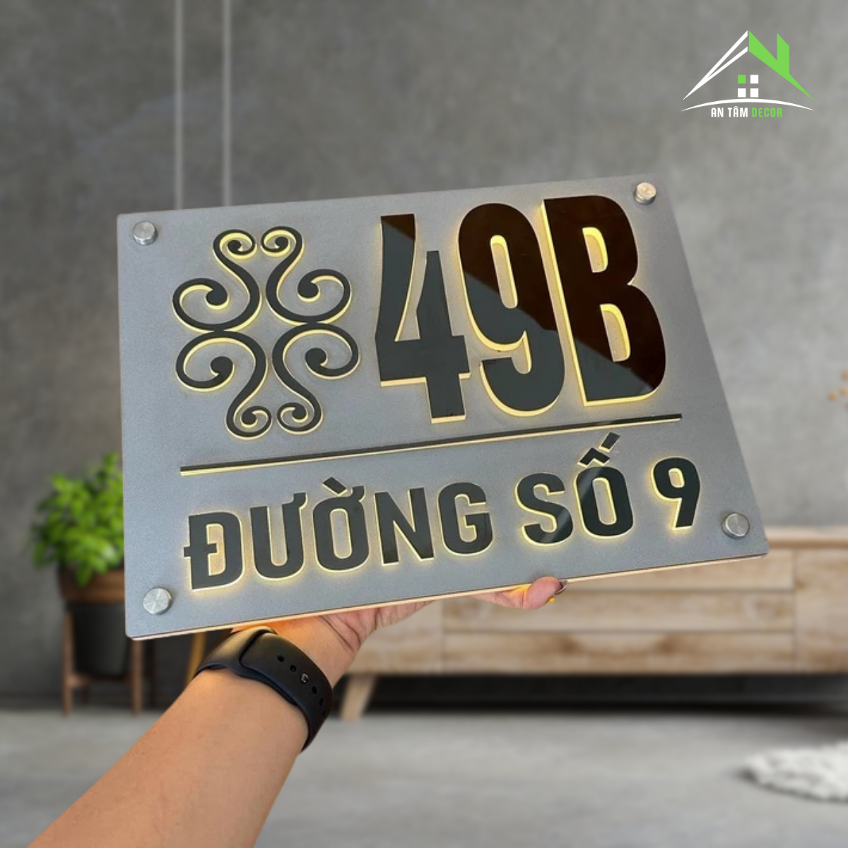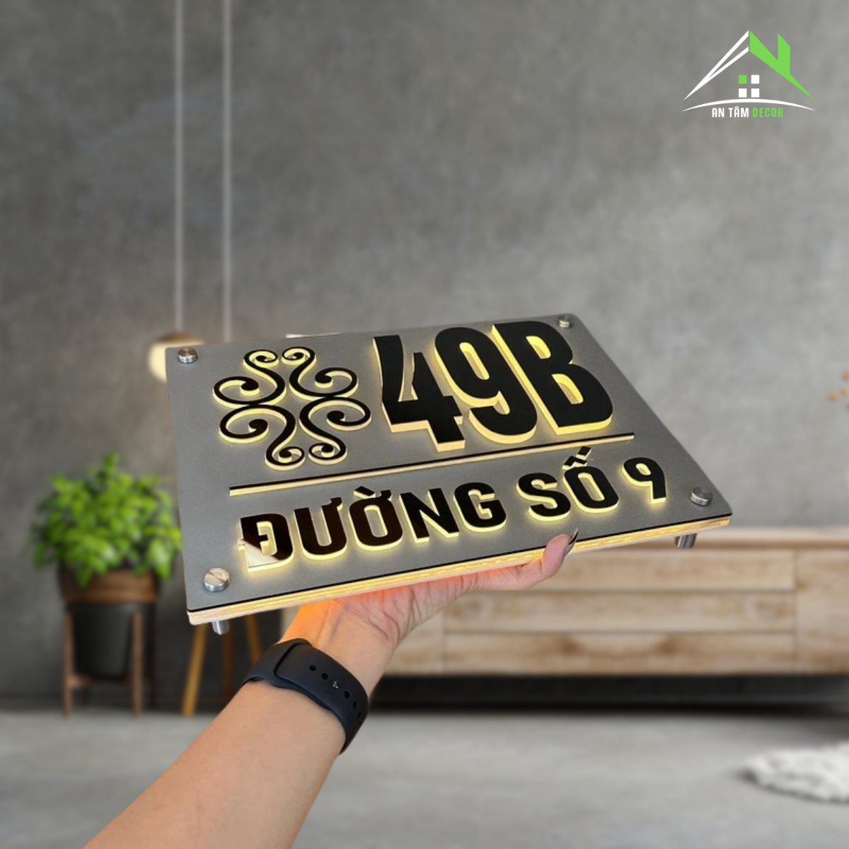 Mặt nền mica màu ghi sần phối inox 304 đen cao cấp, nội dung số nổi được cắt CNC sắc nét từ mica đen phủ bóng.