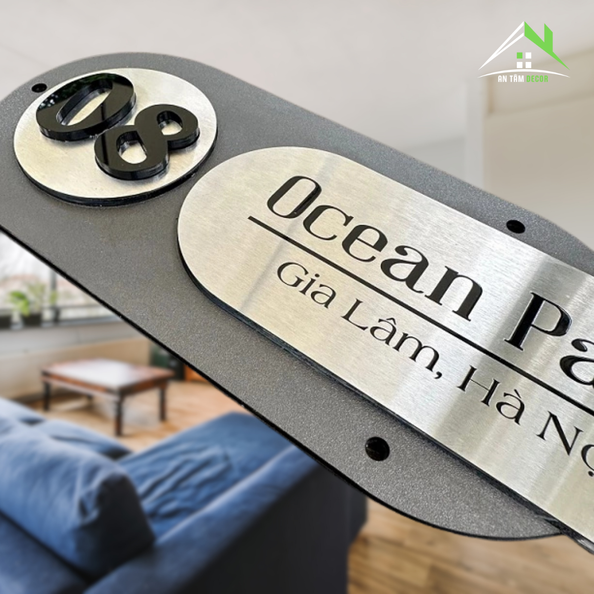 Mẫu bảng được thiết kế bởi An Tâm Decor, vừa có tính thẩm mỹ cao, vừa đảm bảo độ bền trong thời tiết khắc nghiệt. Chất liệu inox 304 không han gỉ, kết hợp mặt mica sần sang trọng và sạch sẽ.