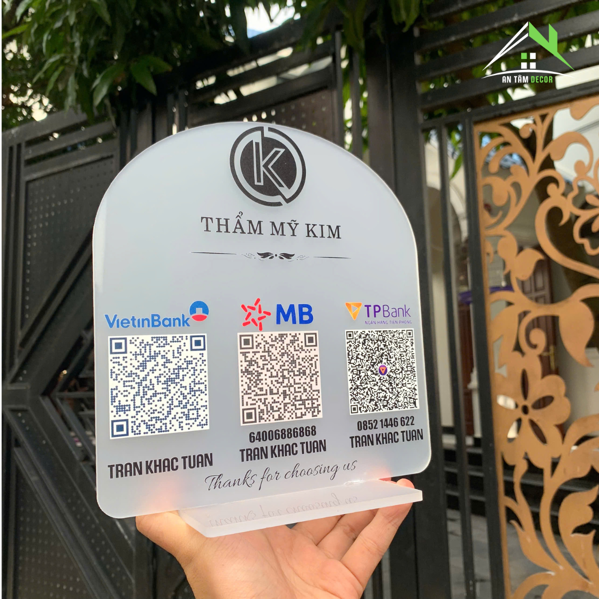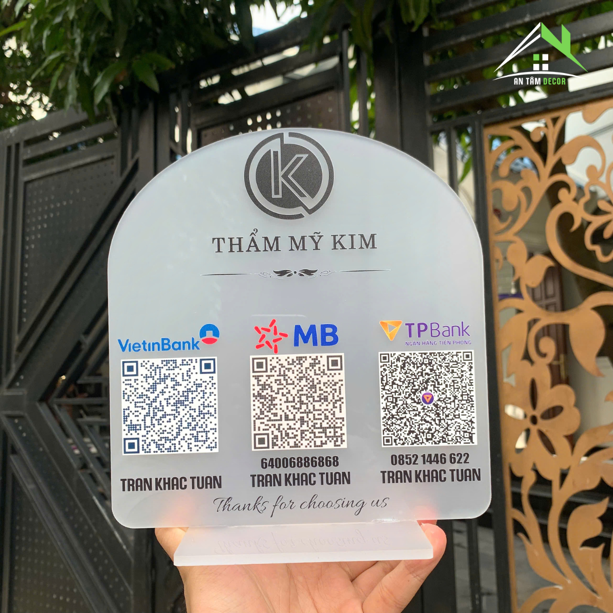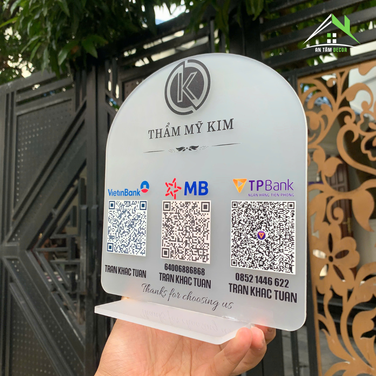 • Thiết kế & phong cách: In UV trực tiếp logo thương hiệu, thông tin ngân hàng và mã QR, màu sắc rõ nét, bền màu lâu dài.