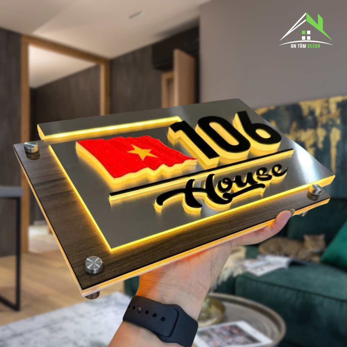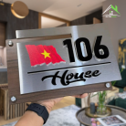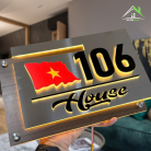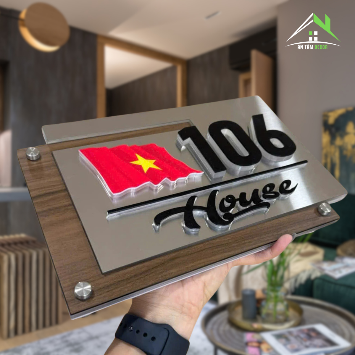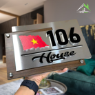 Mặt biển sử dụng inox 304 xước bạc cao cấp, nền mica dán decal vân gỗ. Chữ số và lá cờ nổi làm từ mica đúc bền đẹp.