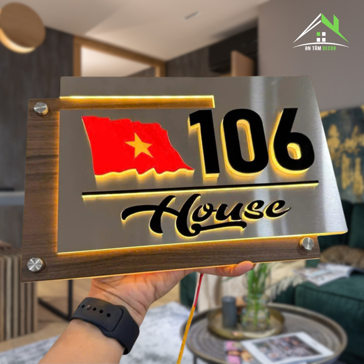 Biển Số Nhà Có Đèn LED – Nền Inox 304 Xước Bạc Kết Hợp Vân Gỗ – Cờ Việt Nổi