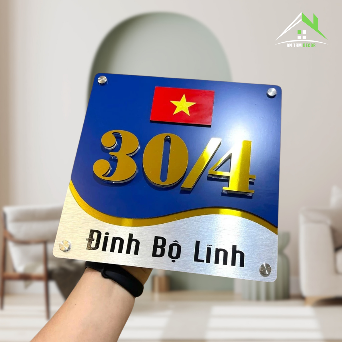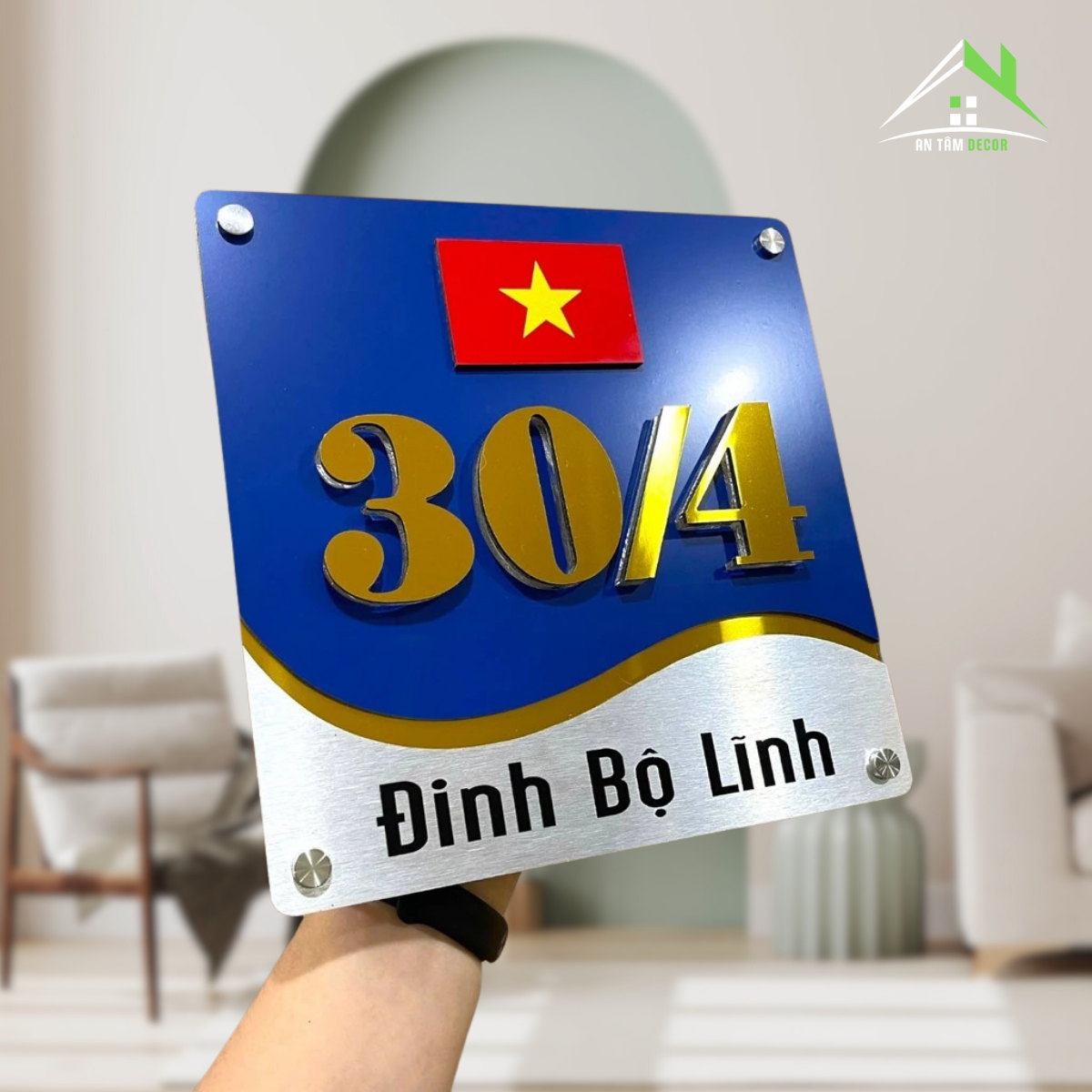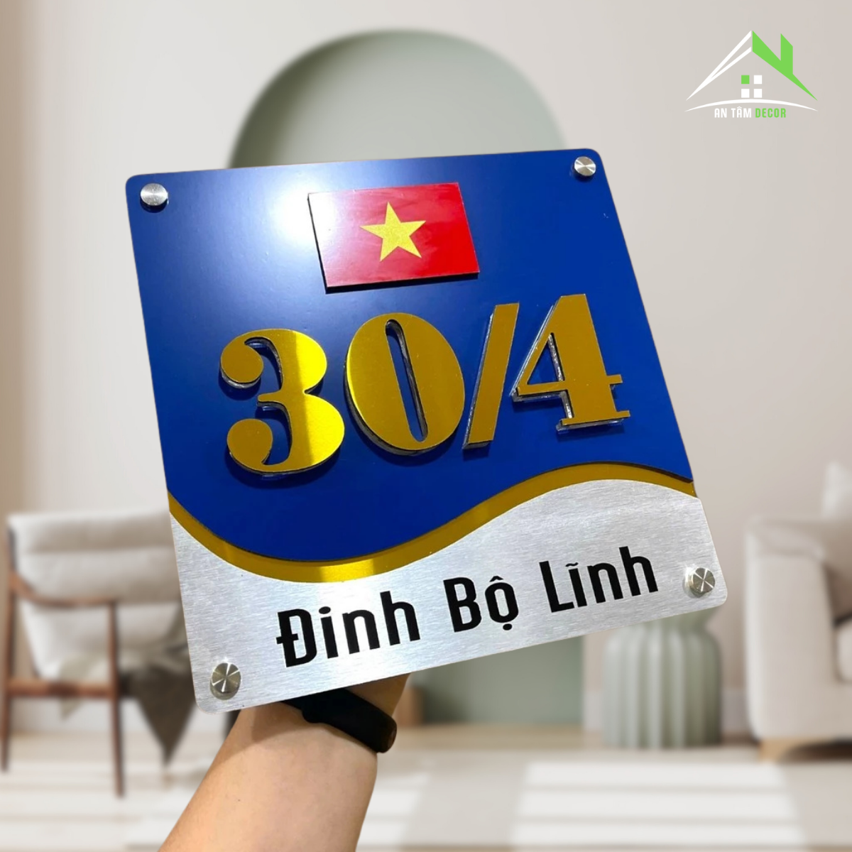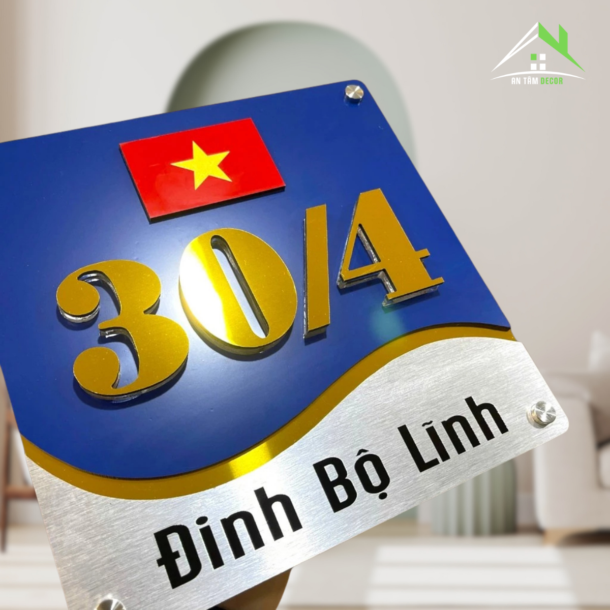 BIỂN SỐ NHÀ NGOÀI TRỜI – NỀN ALOCREST XƯỚC BẠC + VÀNG GƯƠNG, SỐ NỔI 5MM, CÓ IN LÁ CỜ VIỆT NAM