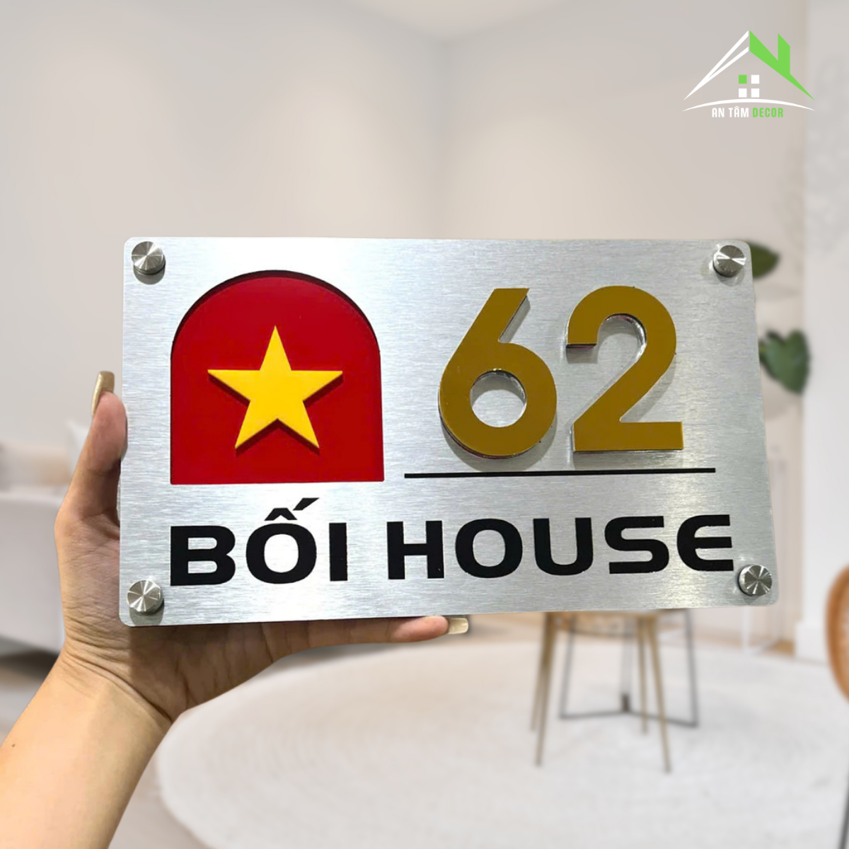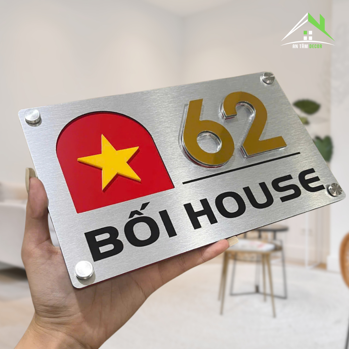 Tấm nền Alcorest bạc xước kết hợp mica nổi cao cấp, chi tiết cờ đỏ sao vàng và số nhà được làm nổi sắc nét, tạo chiều sâu và độ bền vượt trội.
