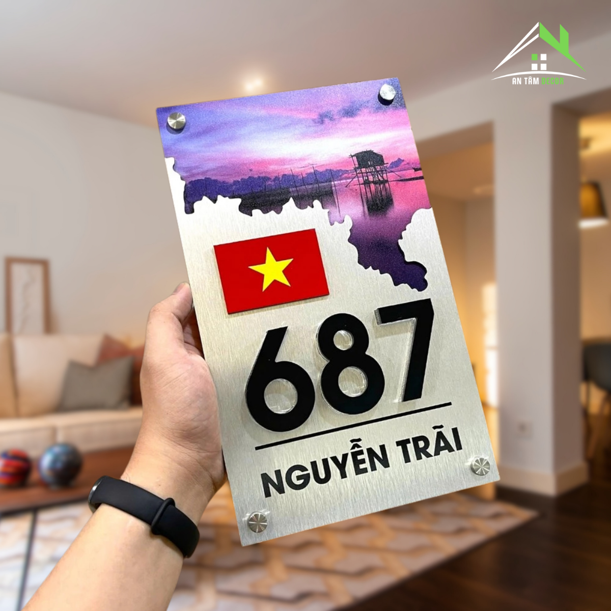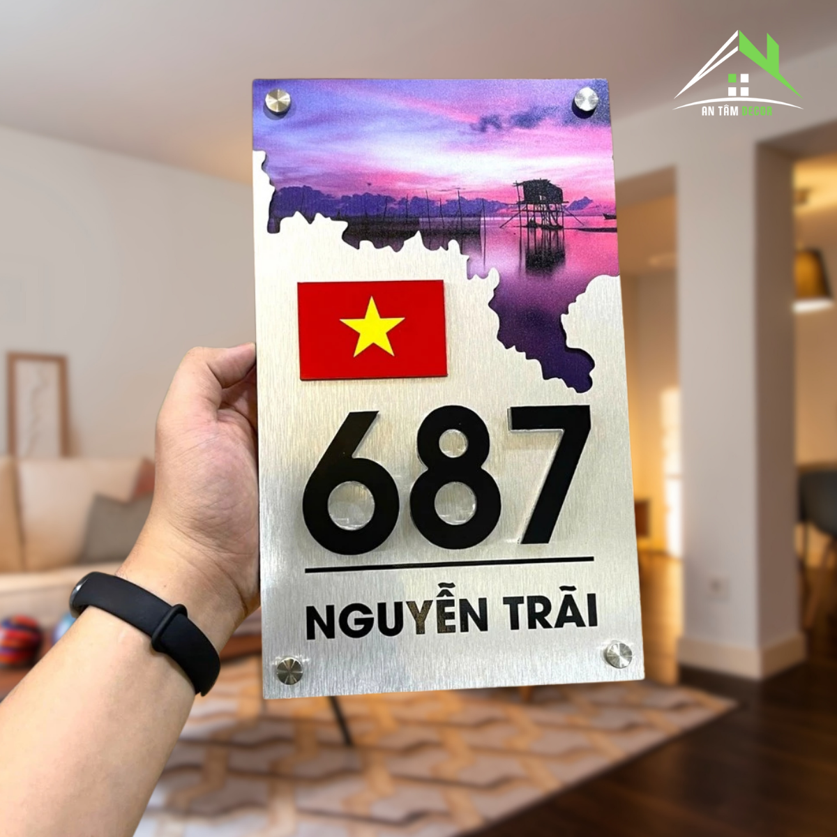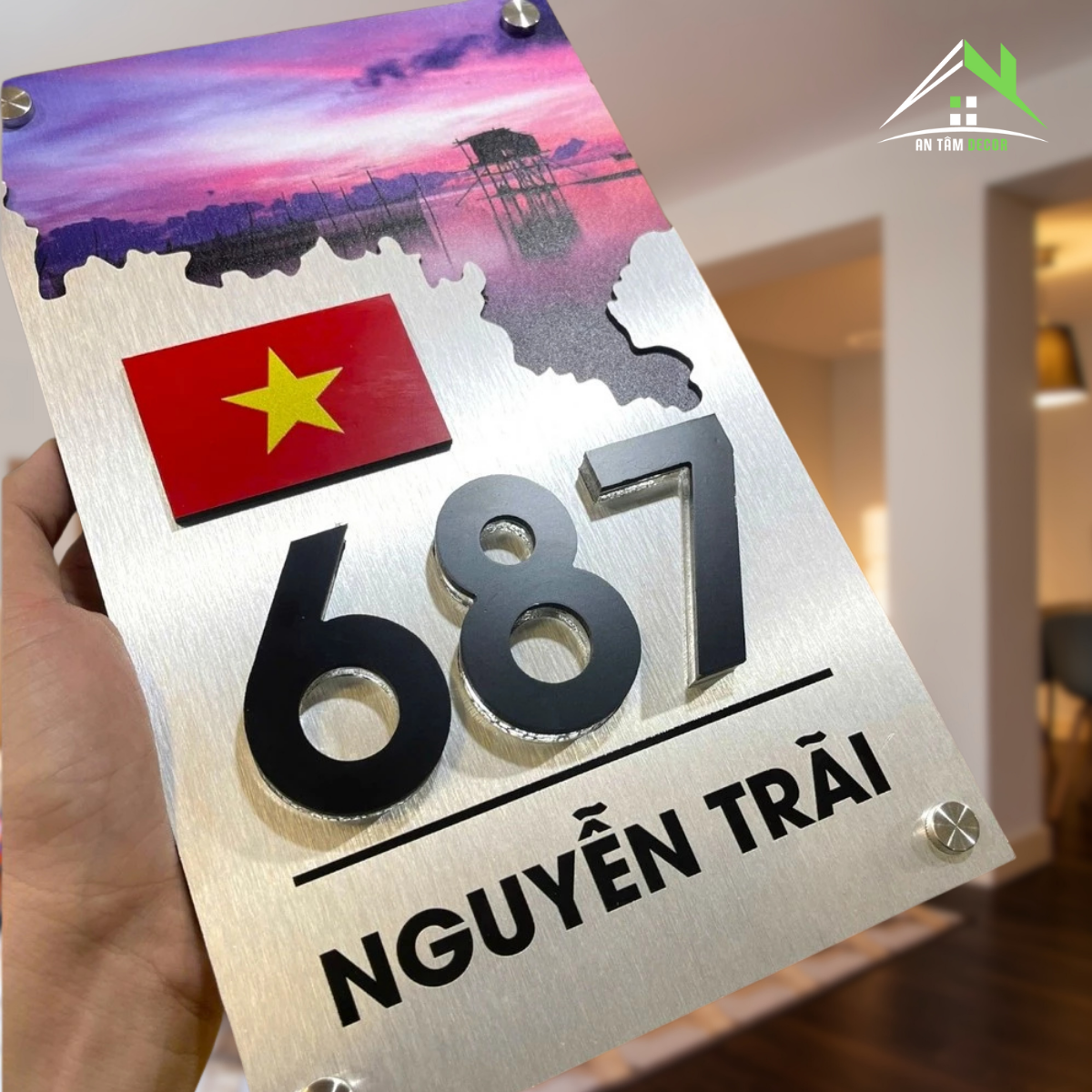 Alcorest kết hợp mica cao cấp, nền xước bạc in UV họa tiết độc đáo, số nhà và lá cờ được làm nổi sắc nét, bền bỉ.