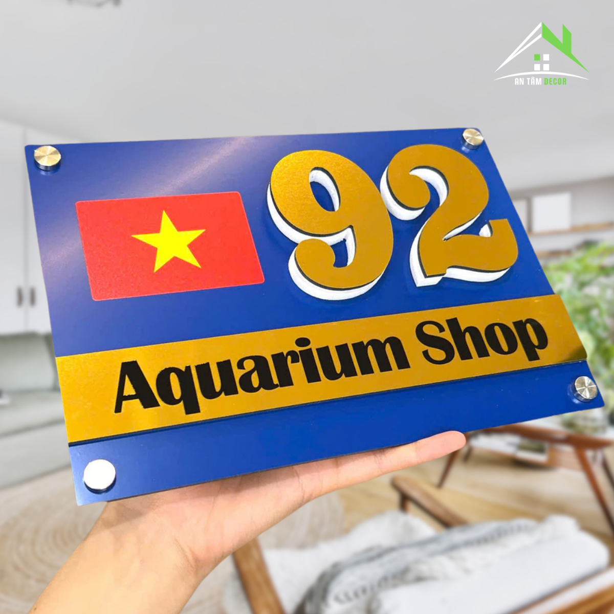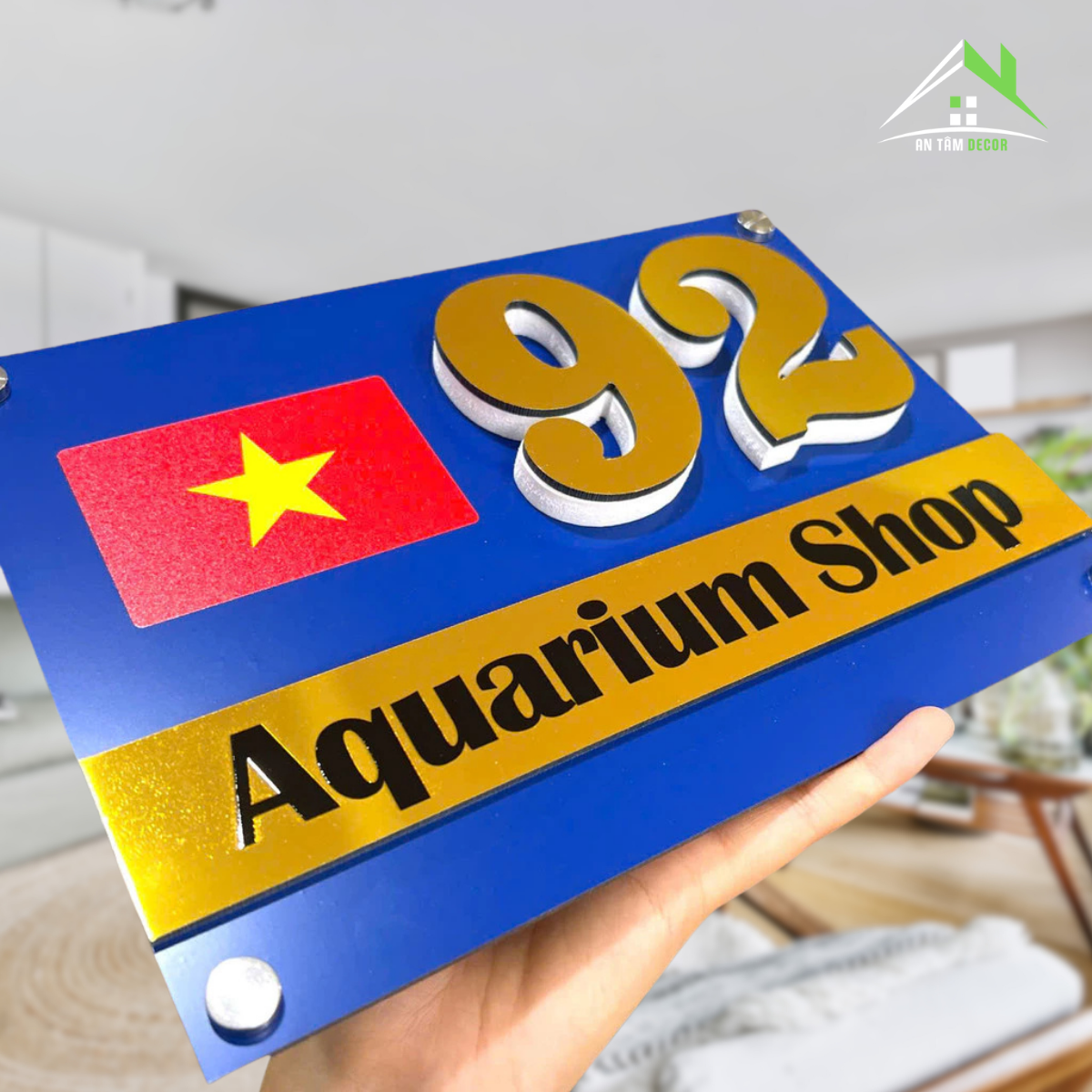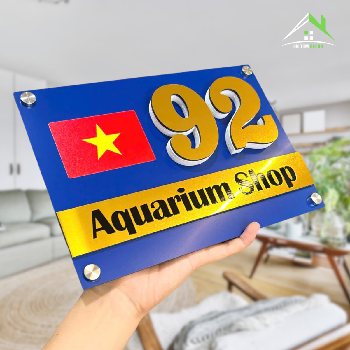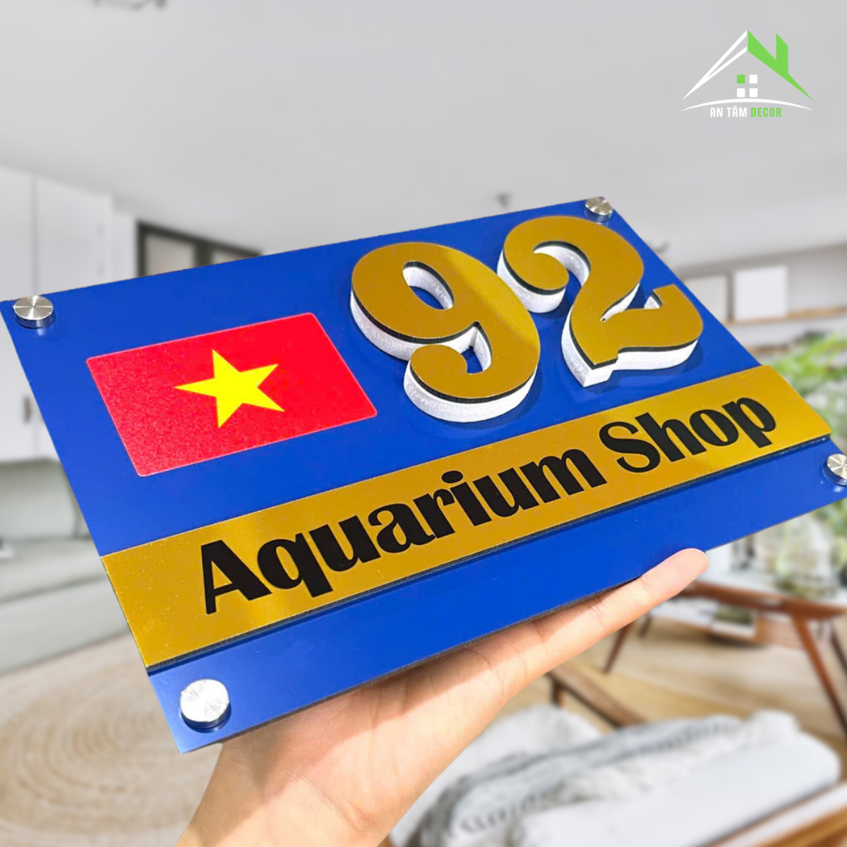 Biển Số Nhà Nền Xanh Dương – Cờ Việt Nam Nổi – Chữ Số Vàng Gương Nổi 10mm