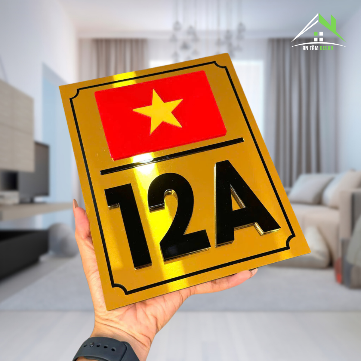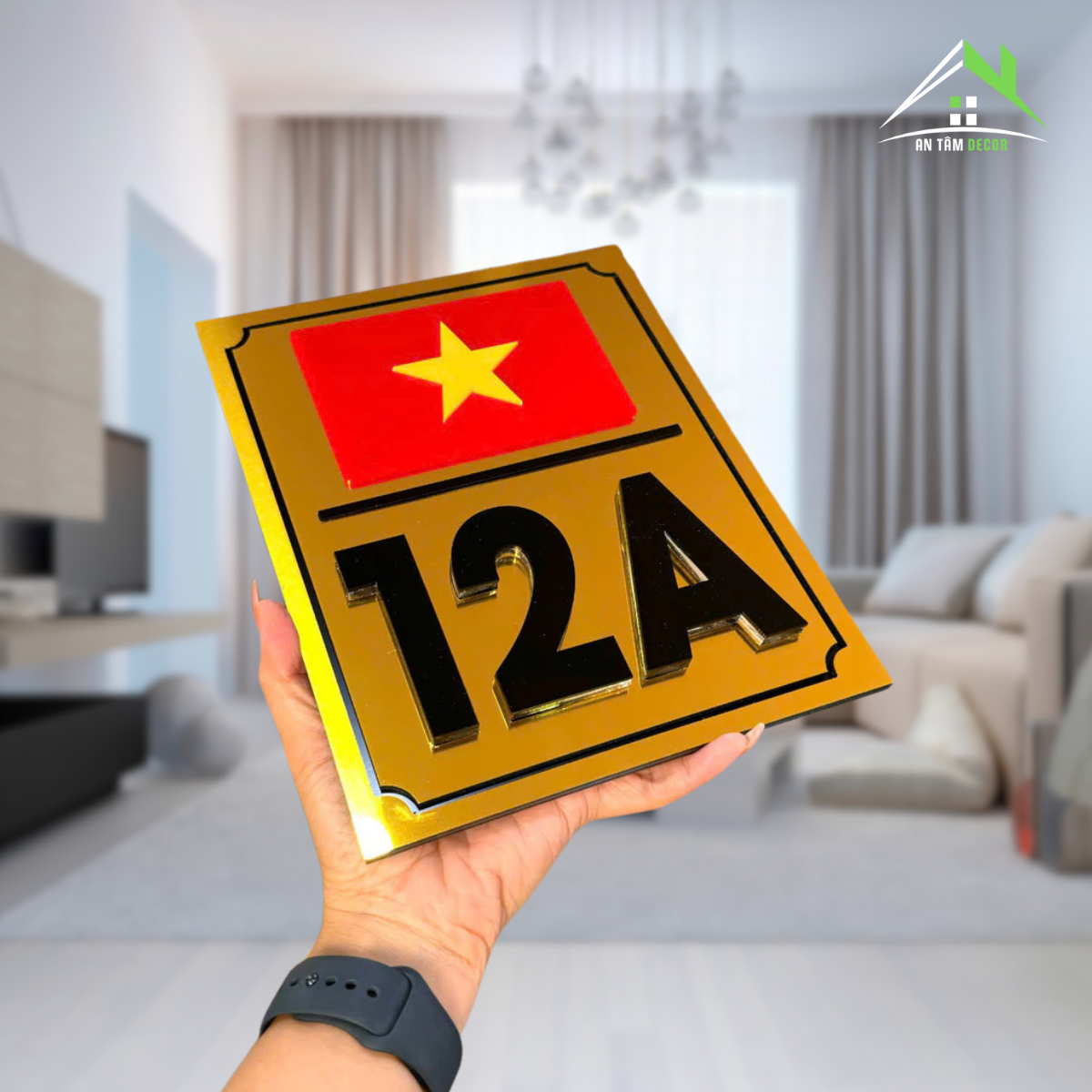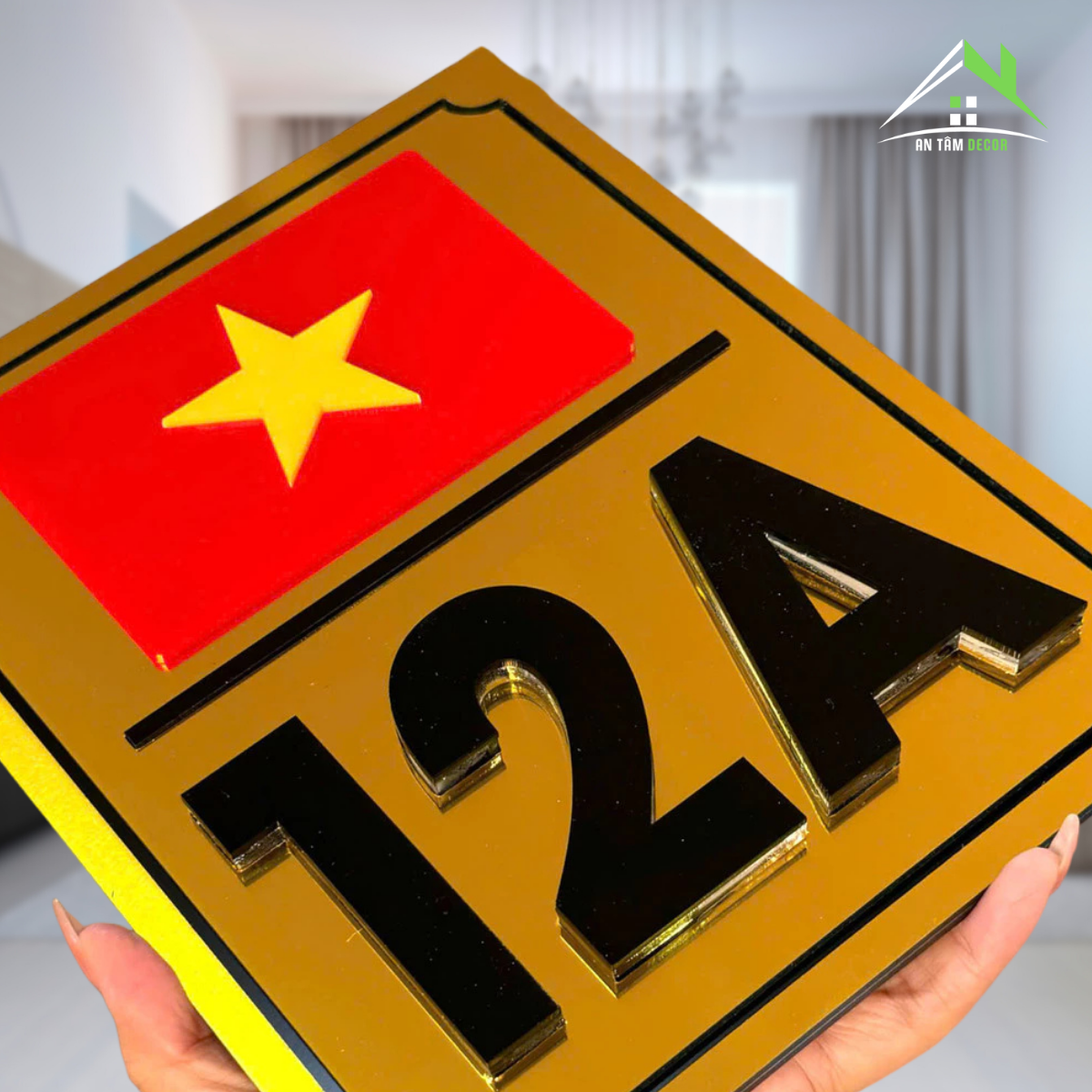 Phần số nhà được cắt nổi dán cách lớp tạo chiều sâu. Lá cờ Việt Nam được in UV rõ nét phía trên tạo điểm nhấn tinh thần dân tộc.