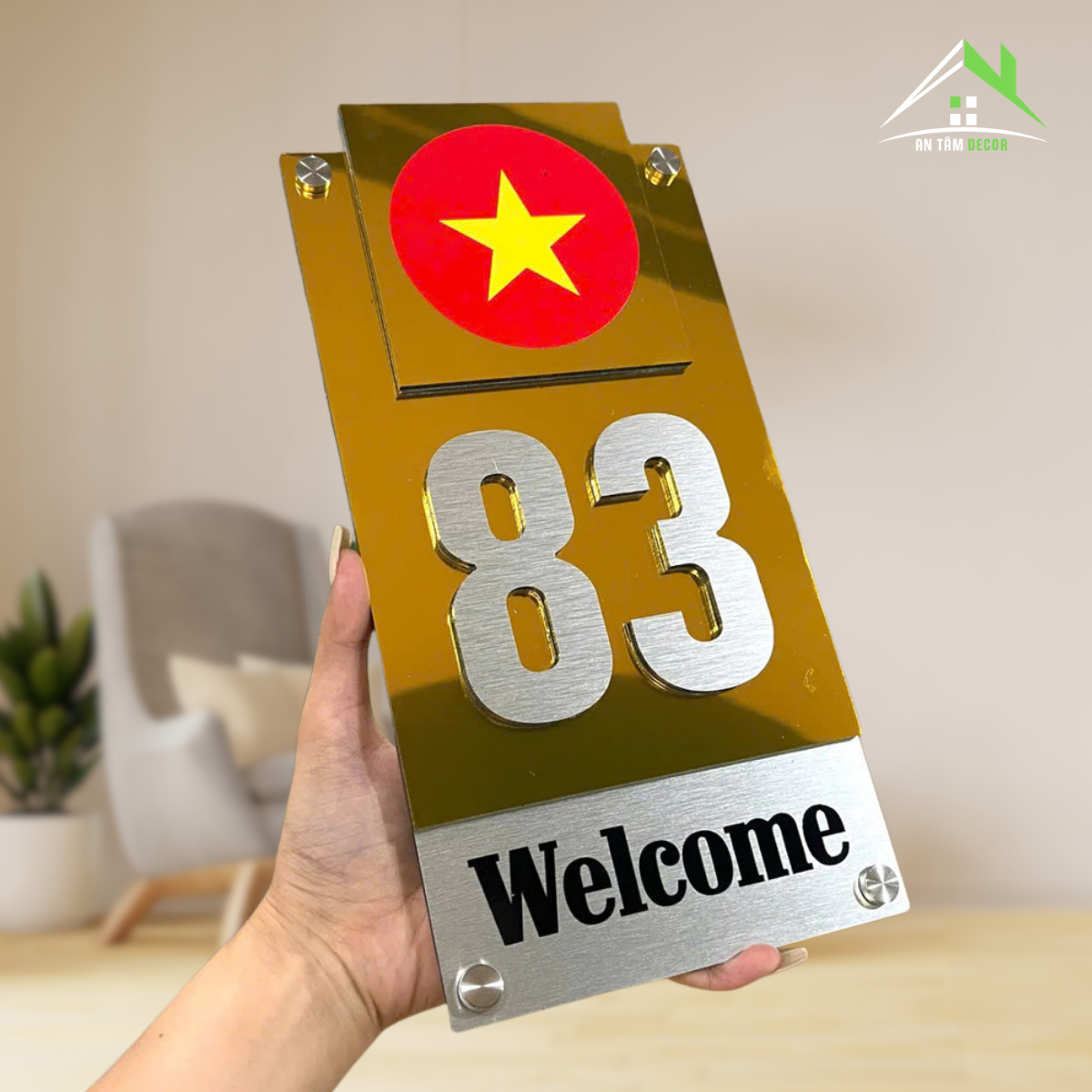 Phong cách hiện đại, kiểu dáng lạ mắt. Thiết kế gồm biểu tượng cờ đỏ sao vàng hình tròn, số nhà nổi bật cùng dòng chữ “Welcome” trang nhã.