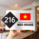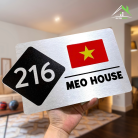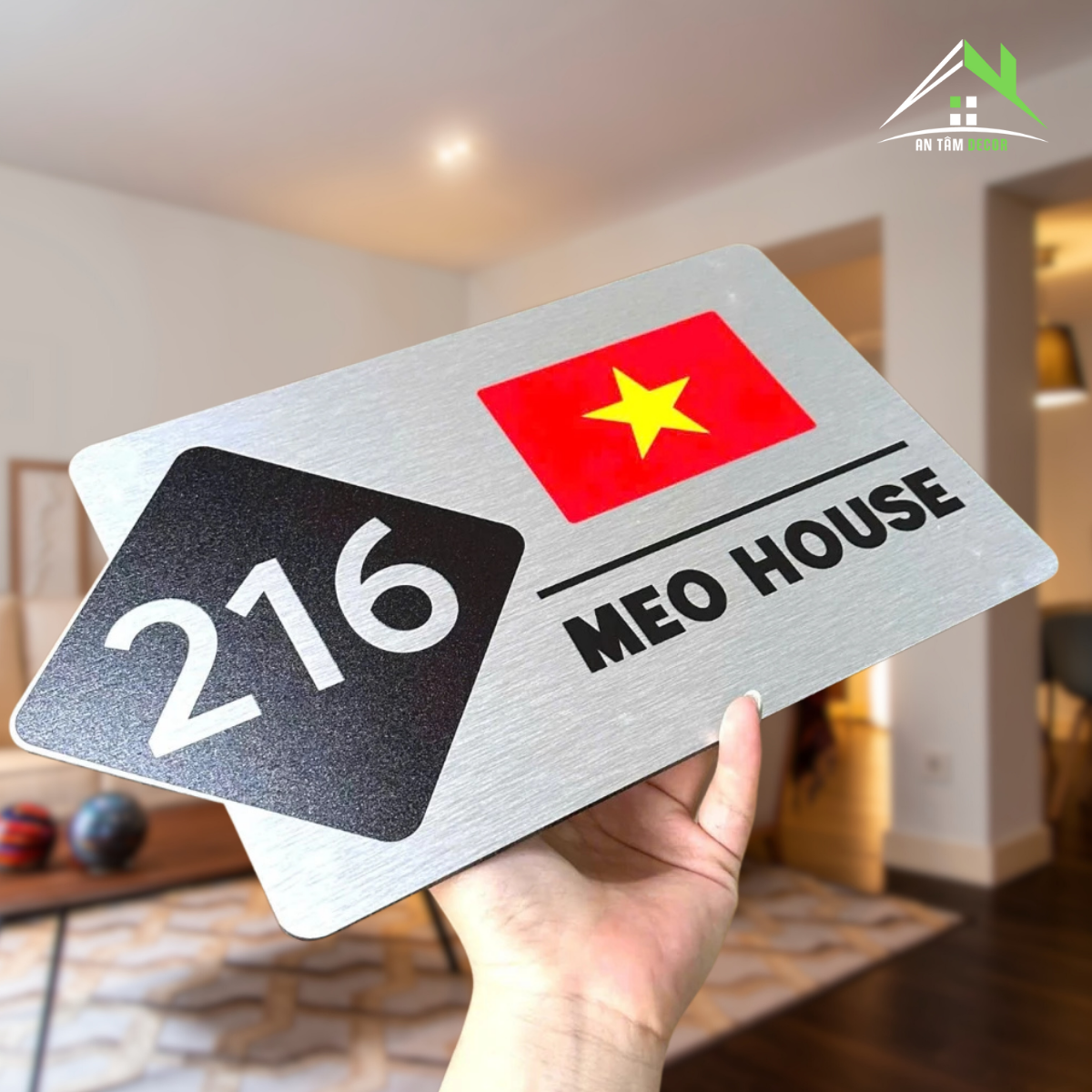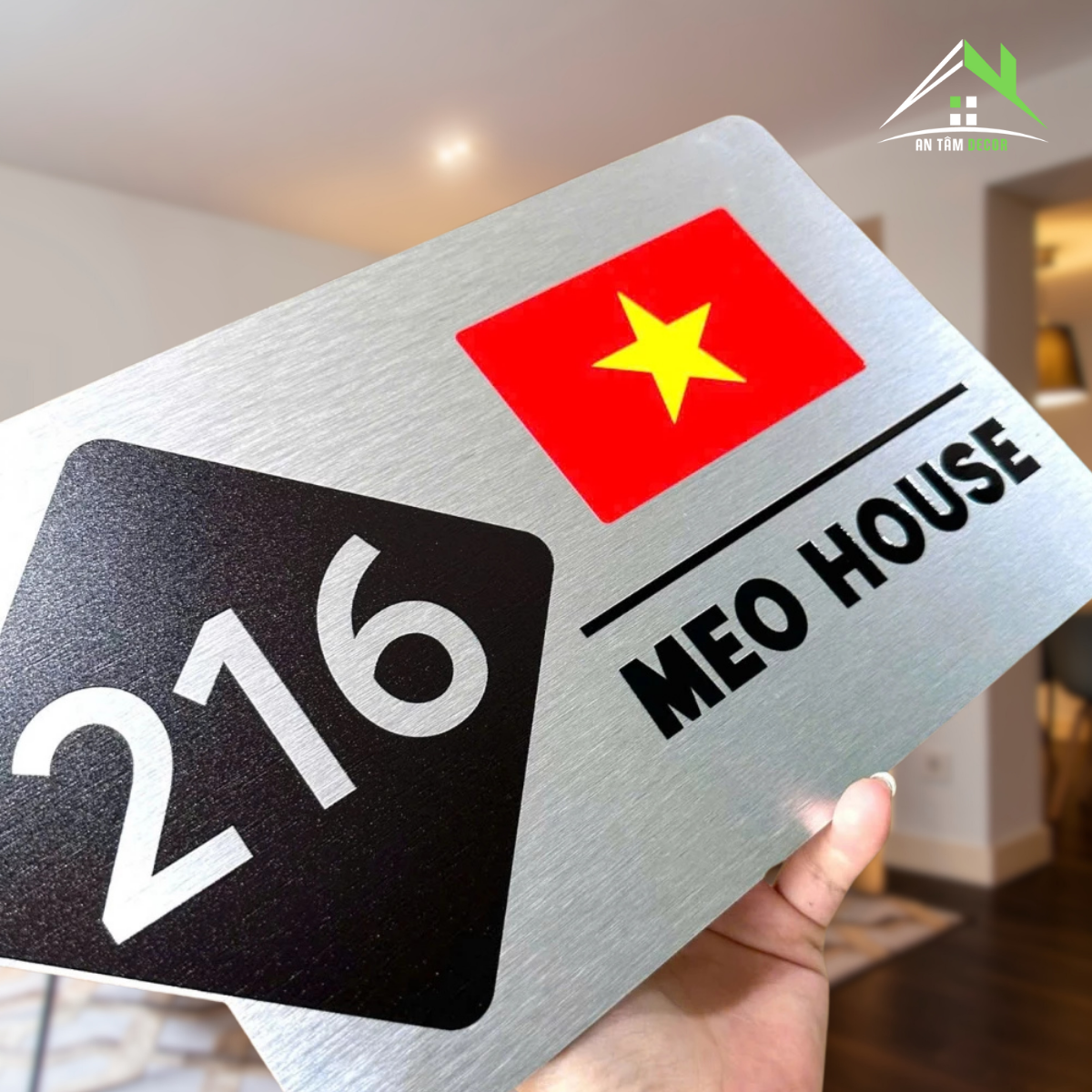 Tấm nền Alu xước bạc dày 3mm, in UV nội dung theo yêu cầu. Cờ Việt Nam và số nhà được in nổi bật sắc nét.
