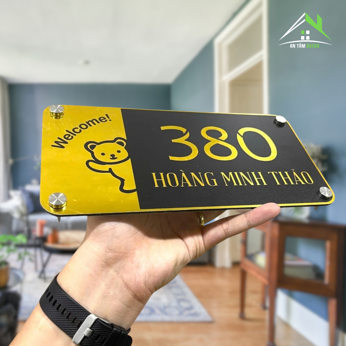 Biển Số Nhà Decor Mẫu Gấu Hello – Alu Vàng Gương, Nội Dung In UV, Rẻ Bền Đẹp