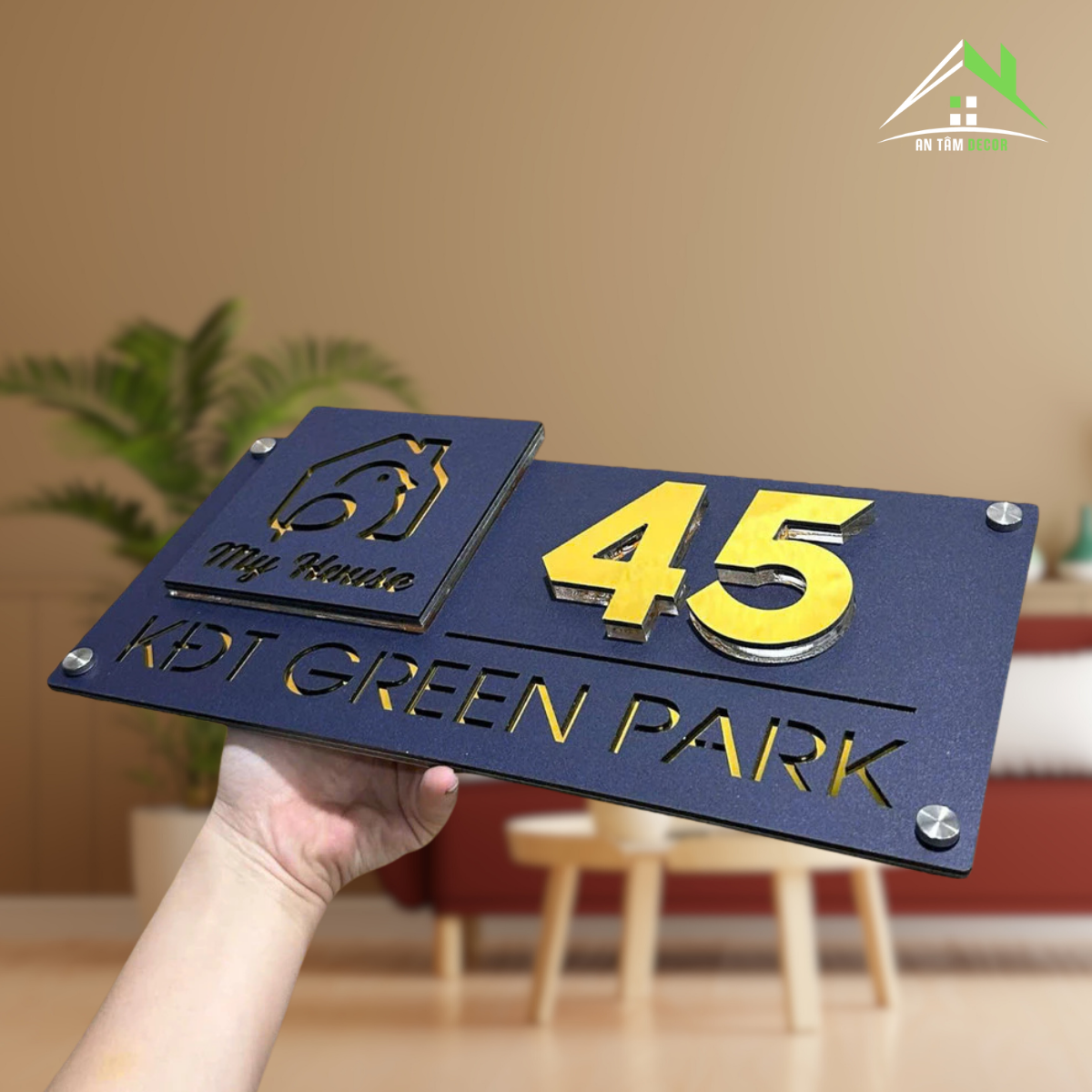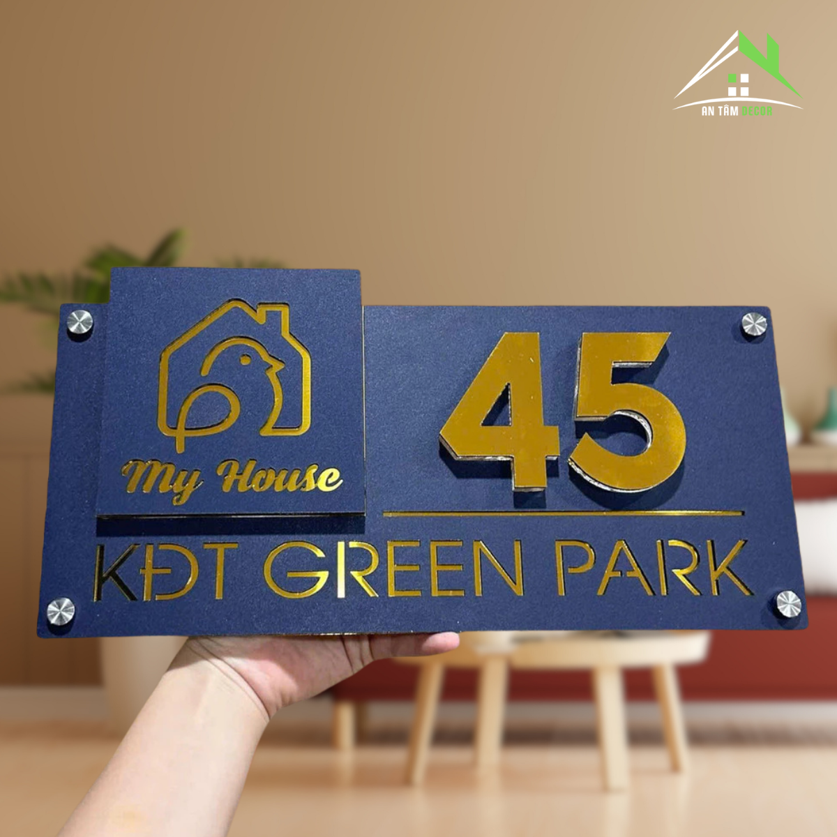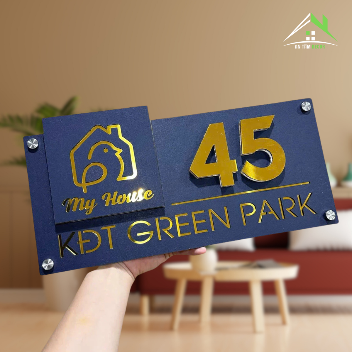 Biển Số Nhà Decor – Nền Xanh Navy, Nội Dung Alcorest Màu Vàng Gương, Số Nổi.