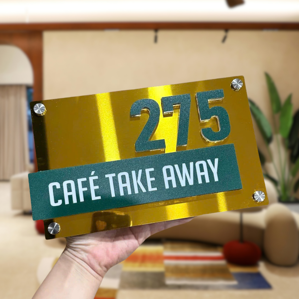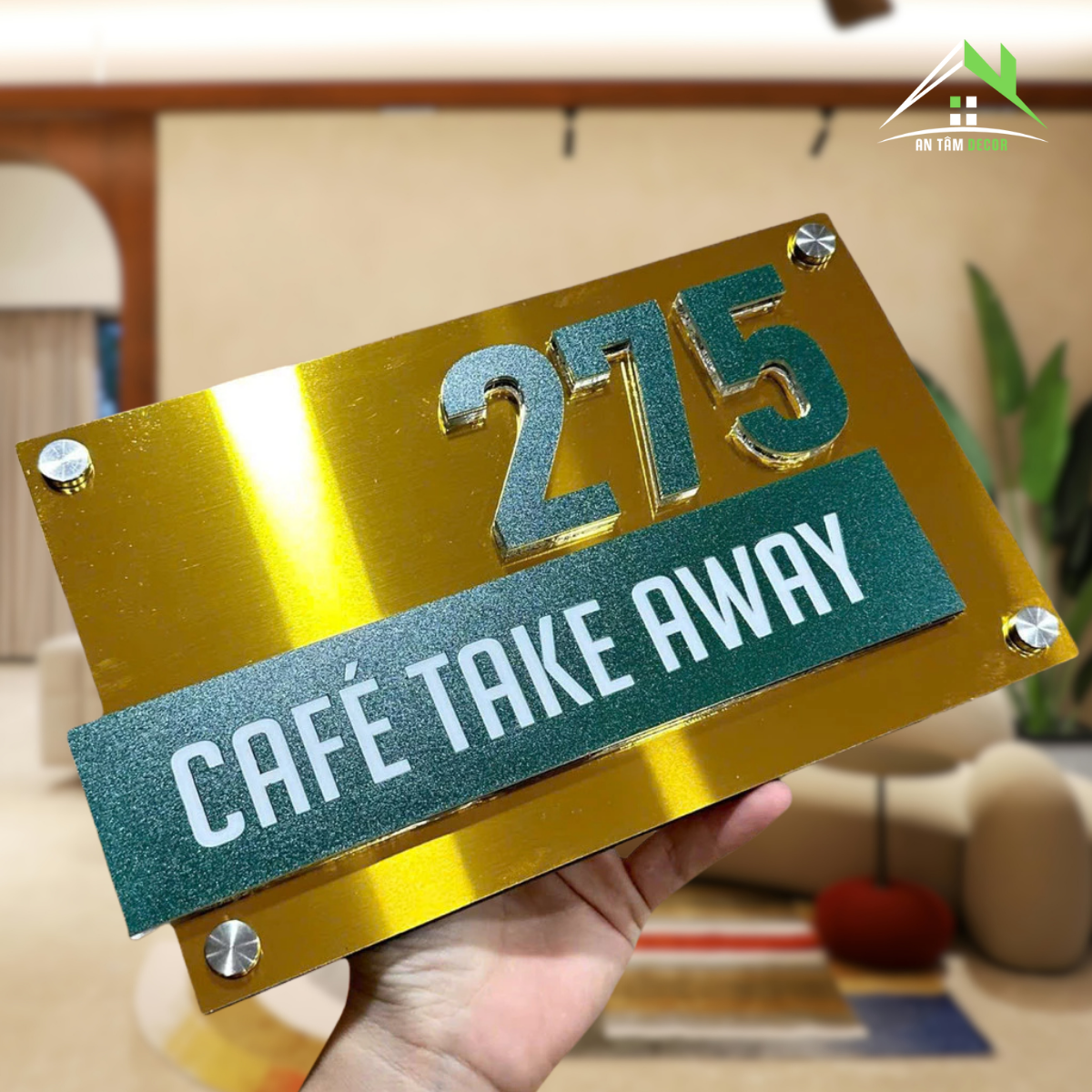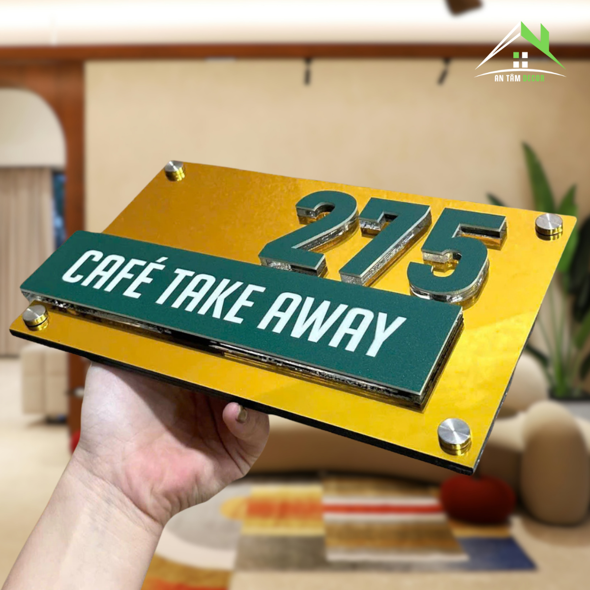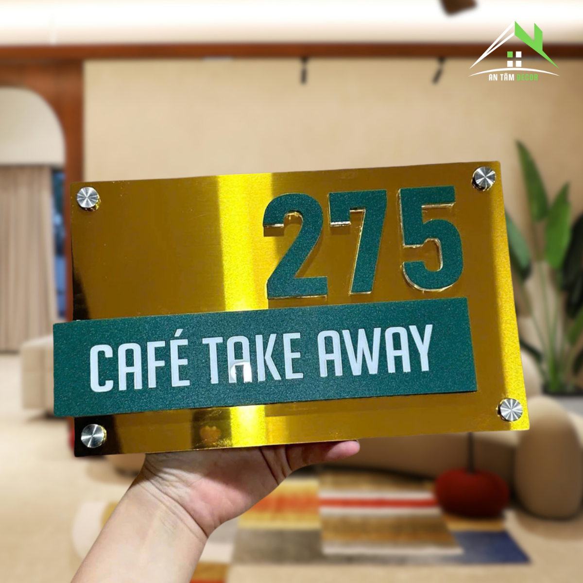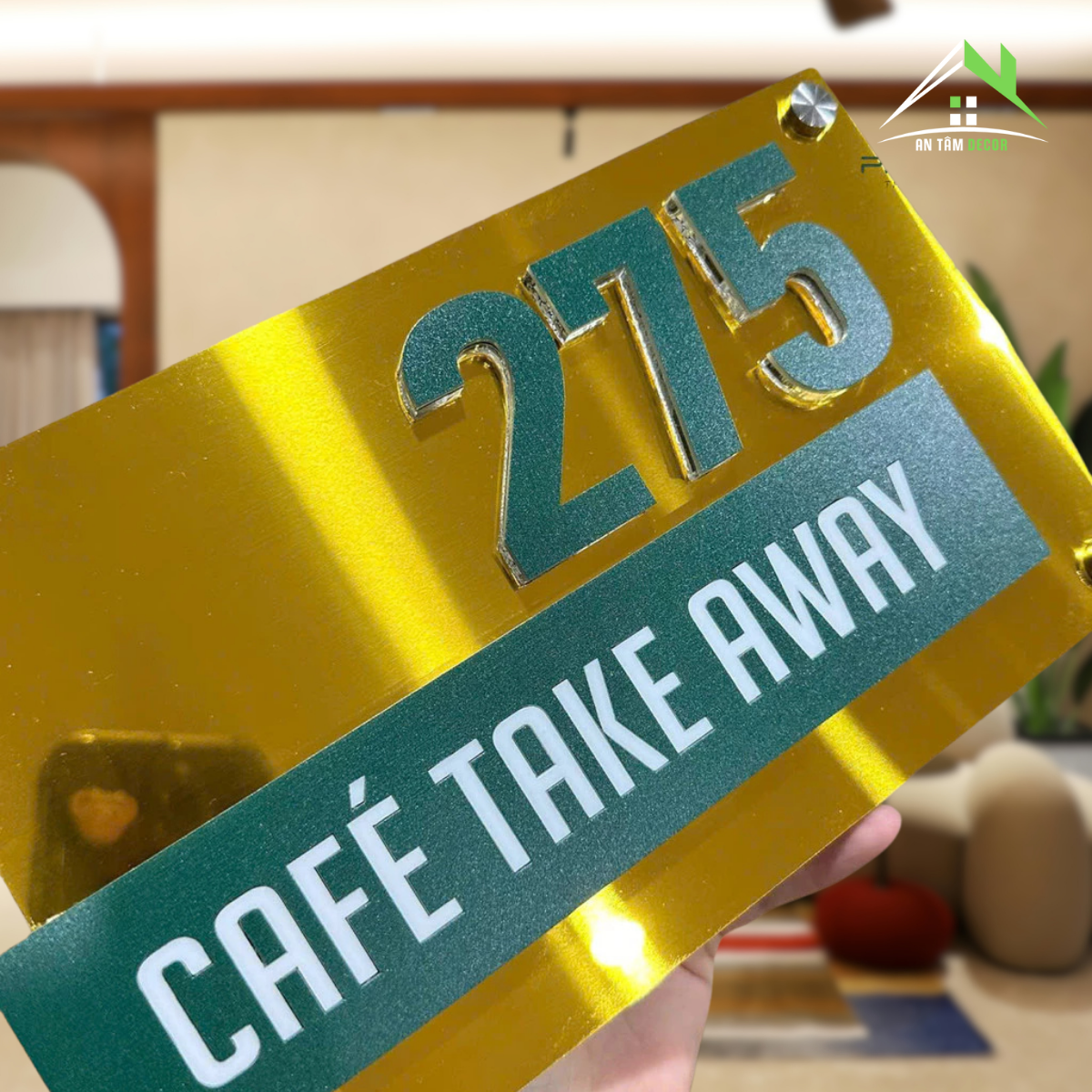 Số nổi 10mm màu xanh ngọc trên nền gương vàng, dòng chữ “Café Take Away” in UV sắc nét, phong cách đơn giản nhưng ấn tượng.